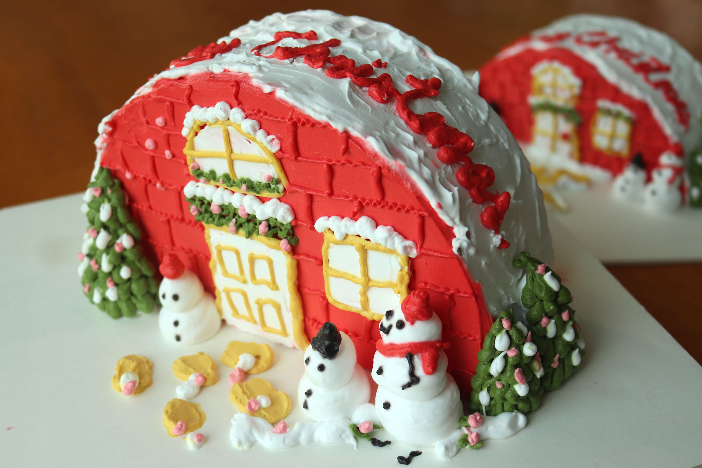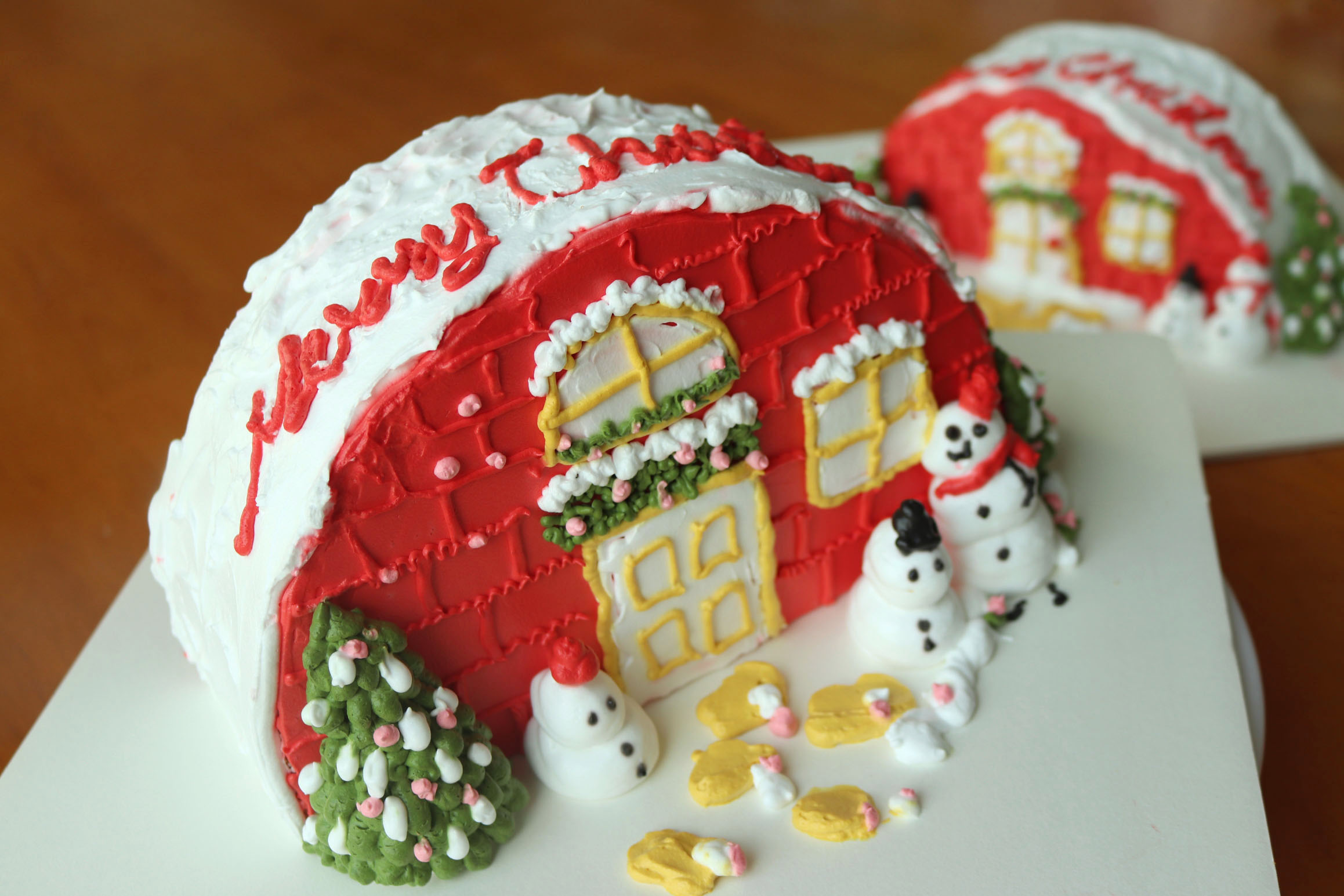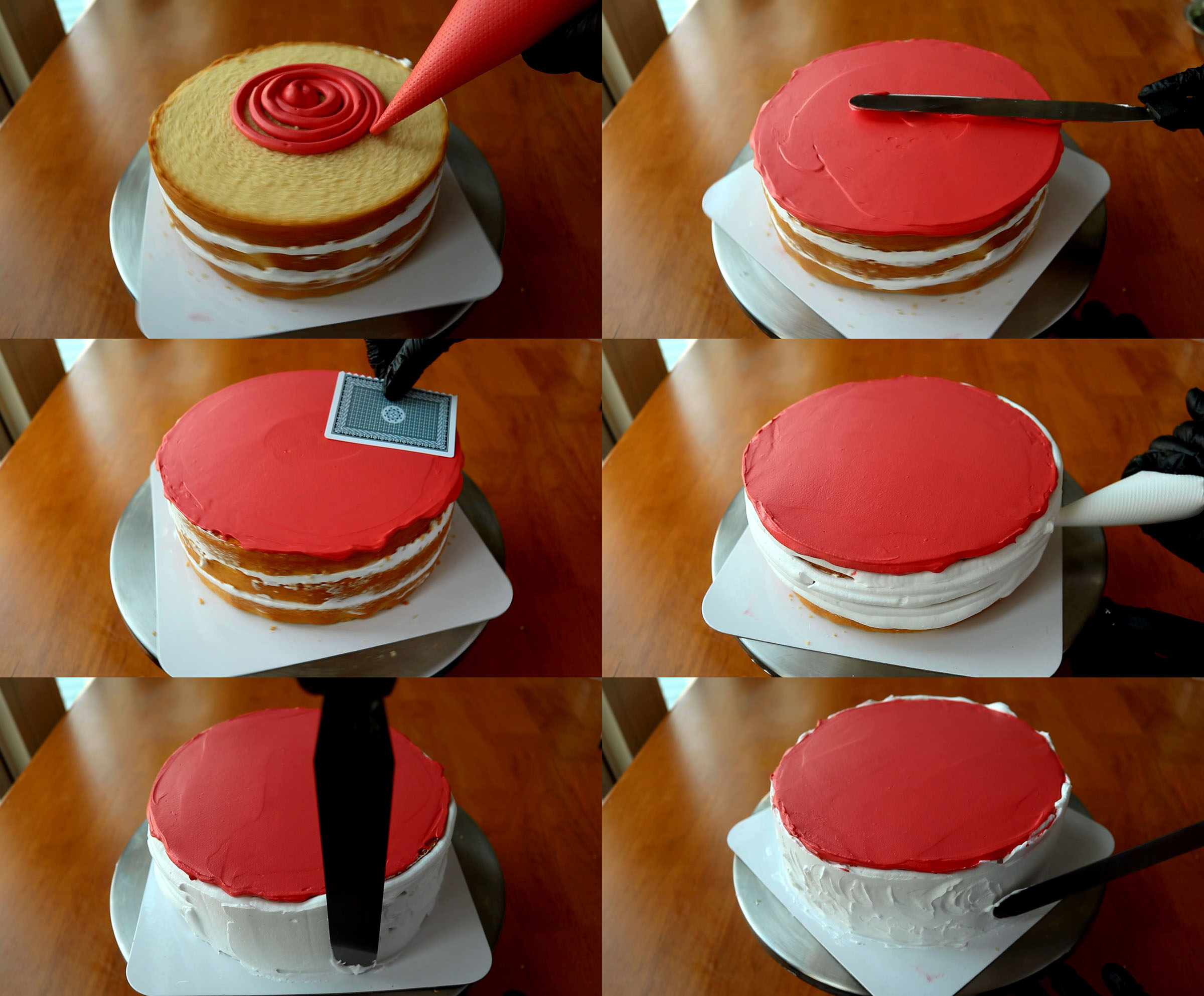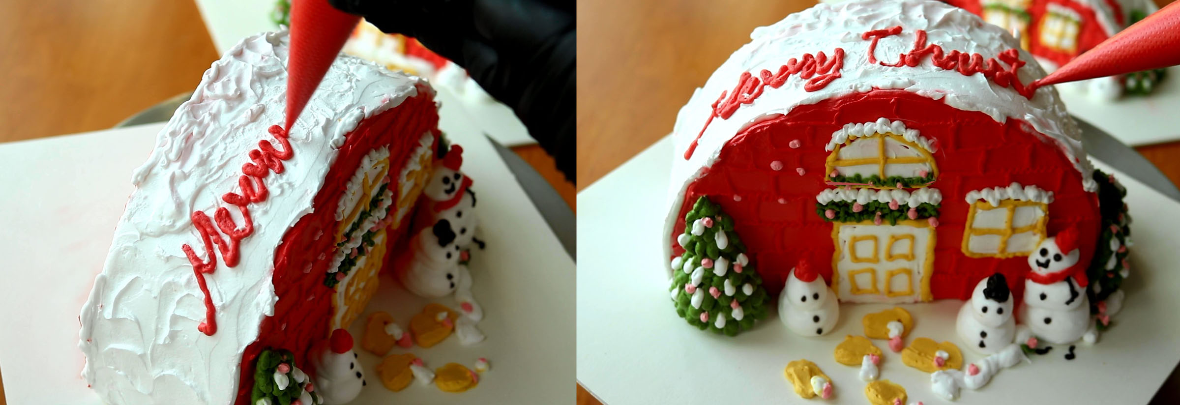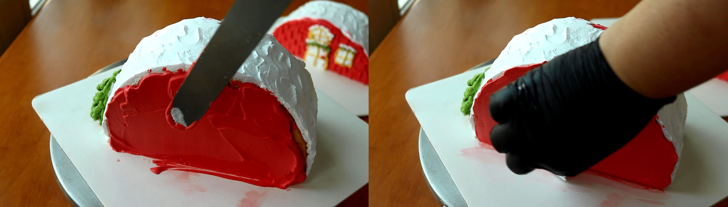 7.ปาดครีมสีแดงลงไปบนหน้าเค้ก ปาดครีมสีขาวตกแต่งเป็นหิมะสีขาว