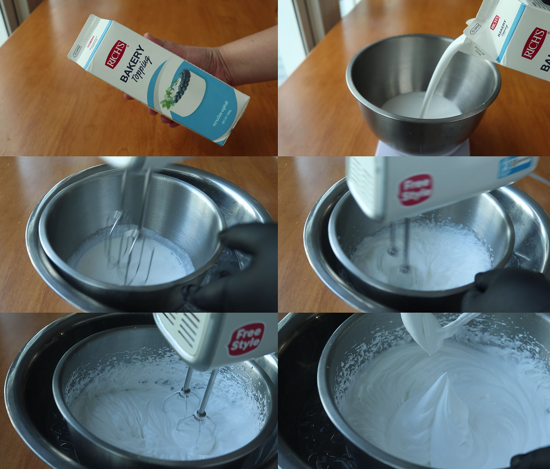 3.เทริชส์ เบเกอรี่ ทอปปิ้ง ลงไปในชามตีให้ได้ความข้นตามต้องการ ริชส์ เบเกอรี่ ทอปปิ้ง ผลิตภัณฑ์ตัวใหม่จากทางริชส์ เป็นวิปปิ้งครีมหวานน้อย อยู่ตัวสูง เนื้อครีมเนียนตีขึ้นฟูง่ายถึง 4.5 เท่า เลยทำให้ได้ปริมาณขนมเยอะขึ้นลดต้นทุน เหมาะสำหรับการปาด ตกแต่ง ทำได้หลากหลายเมนู ผสมสีดี และทนกรดผลไม้