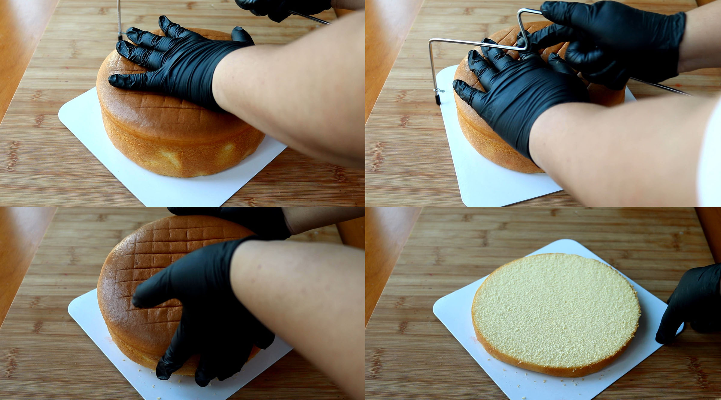 9.แบ่งเค้กให้มีขนาดเกินครึ่งมาประมาณ ½ นิ้ว และนำเค้กมาวางบนแผ่นรองเค้กเปนแนวตั้ง