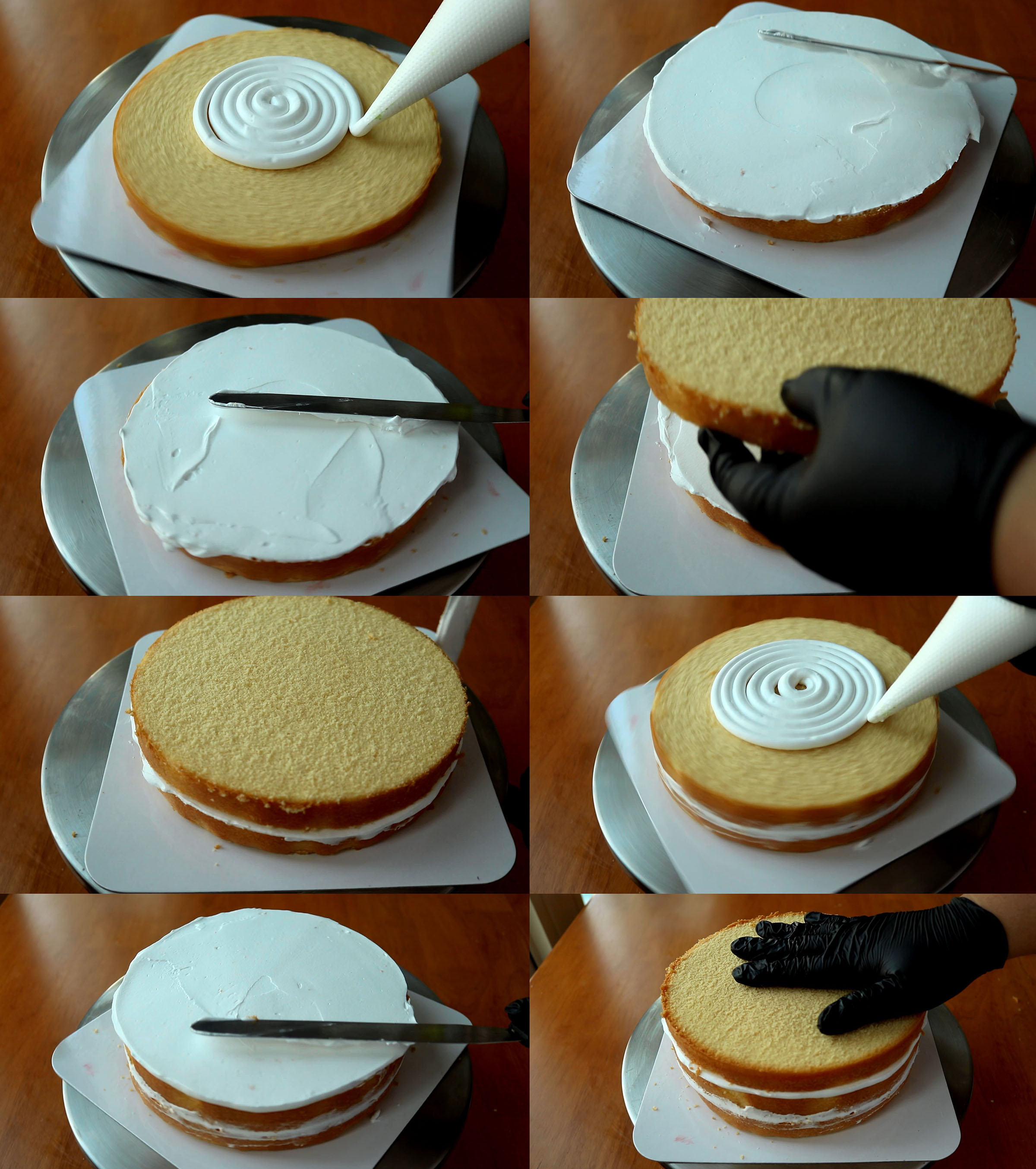 5.ปาดครีมชั้นแรก วางเค้กชั้นที่ 2 ลงไป และปาดครีมอีกที นำเค้กชิ้นที่ 3 มาวางประกบ
