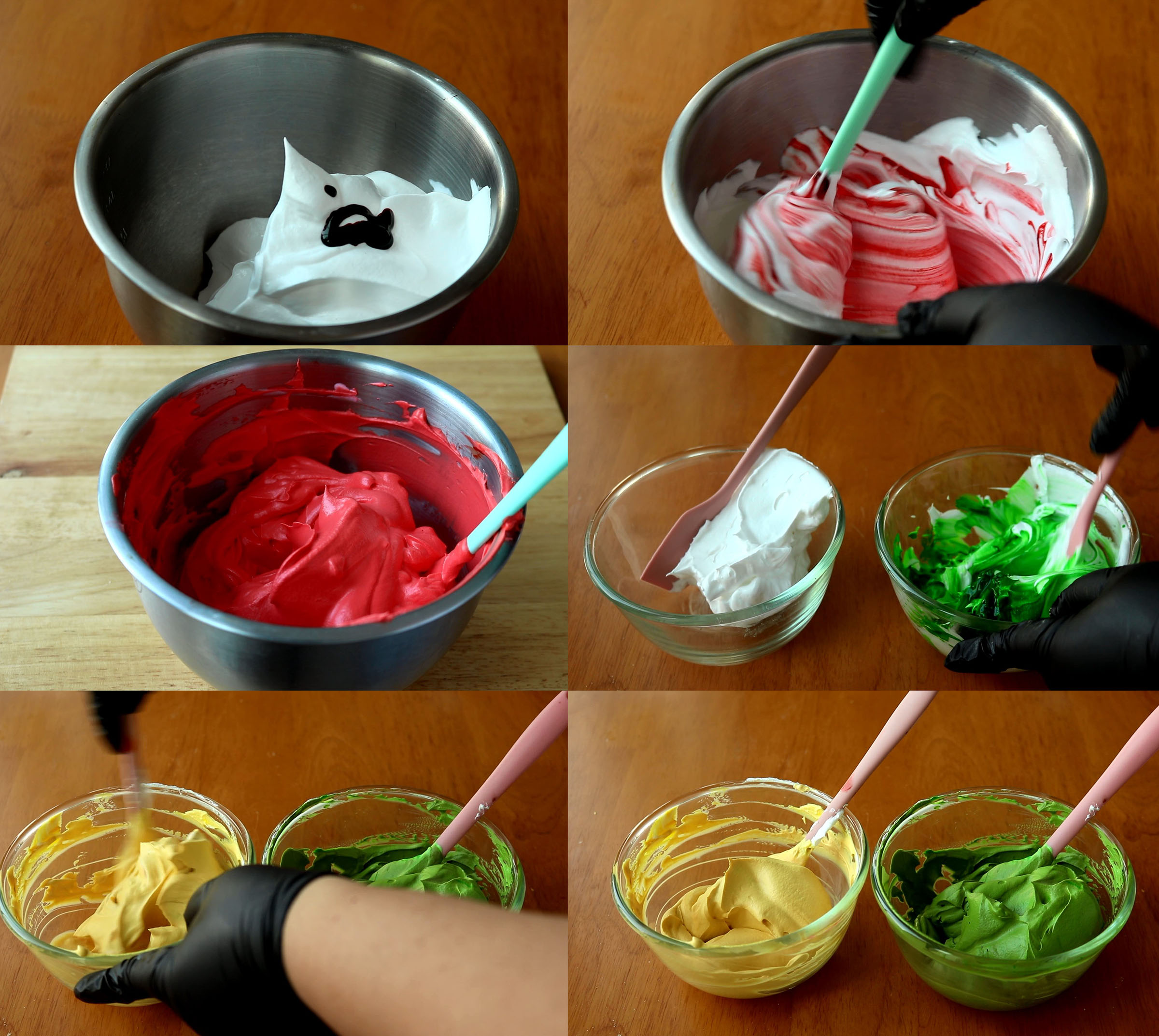 6.ผสมสีวิปครีมตามชอบค่ะ ผสมสีแดง สีเขียว ตามธีมคริสต์มาสค่ะ
