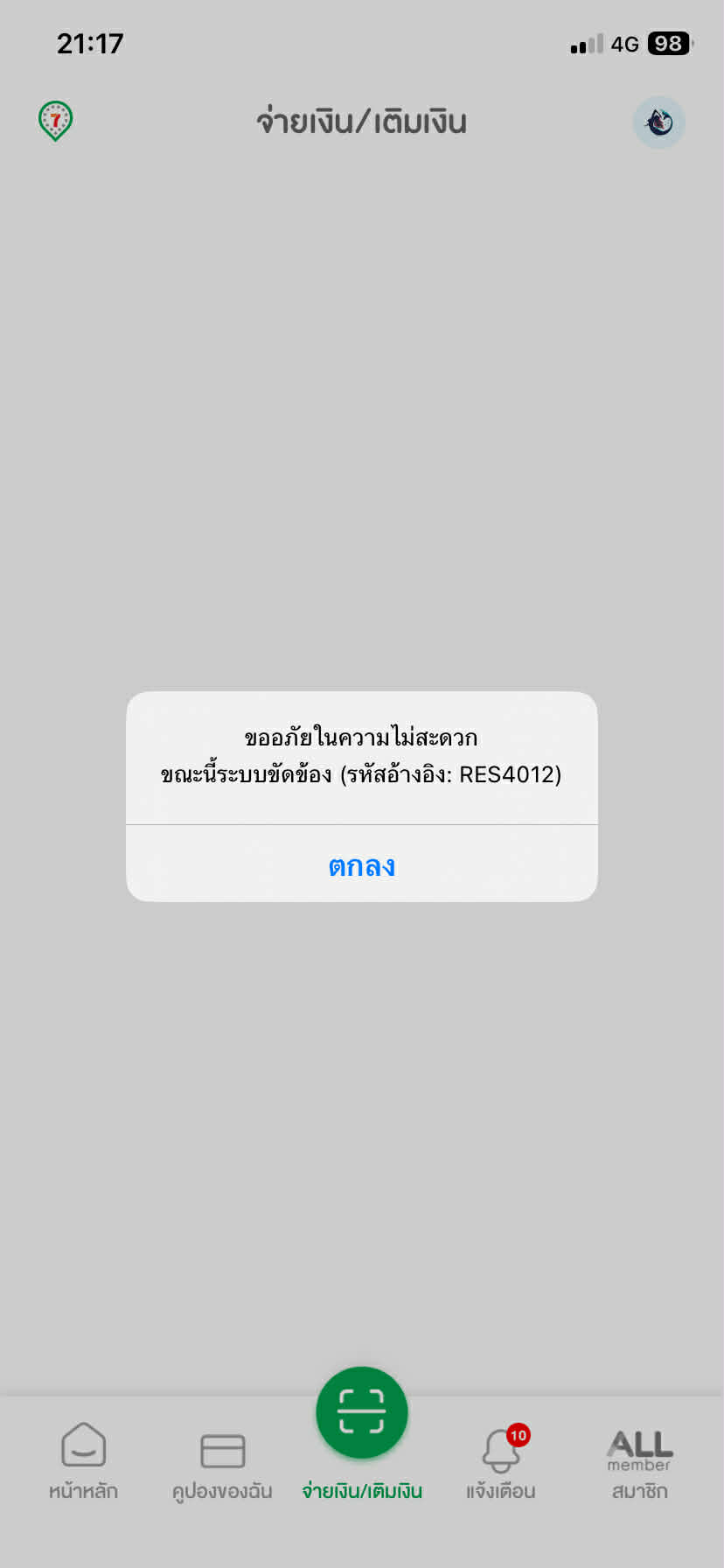 แอป 7-11 กดสแกนจ่าย/เติมเงินไม่ได้ แสดง Error ขออภัยในความไม่สะดวก ขณะนี้ระบบขัดข้อง (รหัสอ้างอิง: RES4012) ตลอดเลย แก้ให้หน่อยครับ