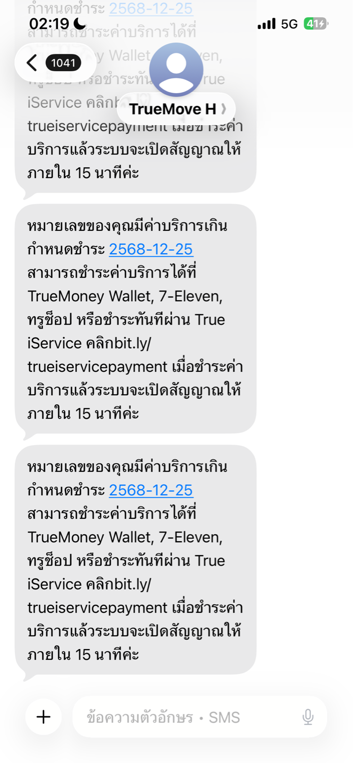 เปลี่ยนจากเติมเงินเป็นรายเดือนเมื่อวันที่ 22 เดือนที่แล้ว วันที่ 1 ตัดสัญญานแต่กลับไม่มียอดให้ชำระ พอเปิดมาให้ใหม่ ขึ้นให้ชำระ 25 ธันวา คือปกติมันควรจะต้องใช้ 1 เดือนไหม แล้วมาตัดเน็ตตอนตี 2 ต้องเดินมาเชื่อมไวไฟคนข้างบ้านคืออะไร ทรู ติดต่อกลับด่วน ไม่ตลกเลย
