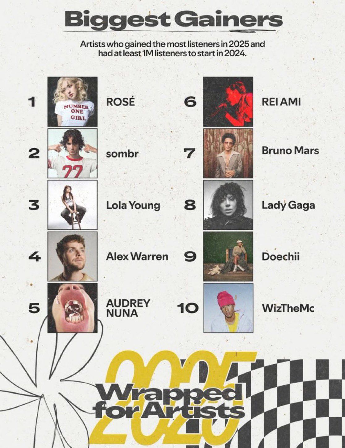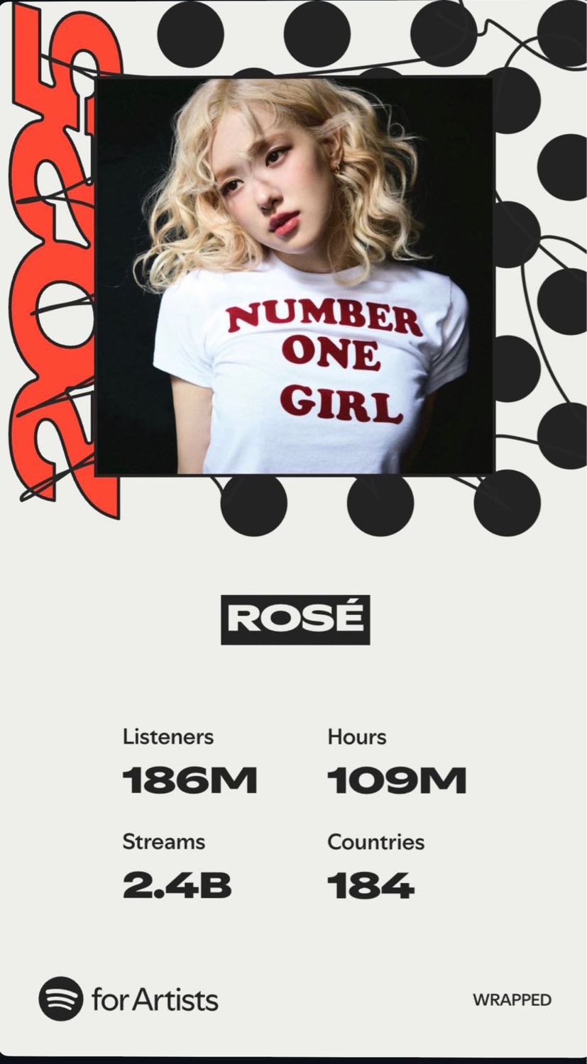 โรเซ่ เป็นศิลปินที่มีผู้ฟังไม่ซ้ำกันสูงสุดในประวัติศาสตร์ของศิลปิน K-pop บน Spotify