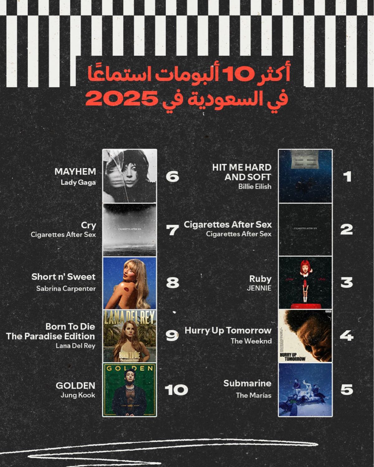 อัลบั้มที่มียอดสตรีมเยอะที่สุดบน Spotify Saudi Arabia ในปี 2025 อันดับ 3 เป็นอัลบั้ม RUBY ของเจนนี่