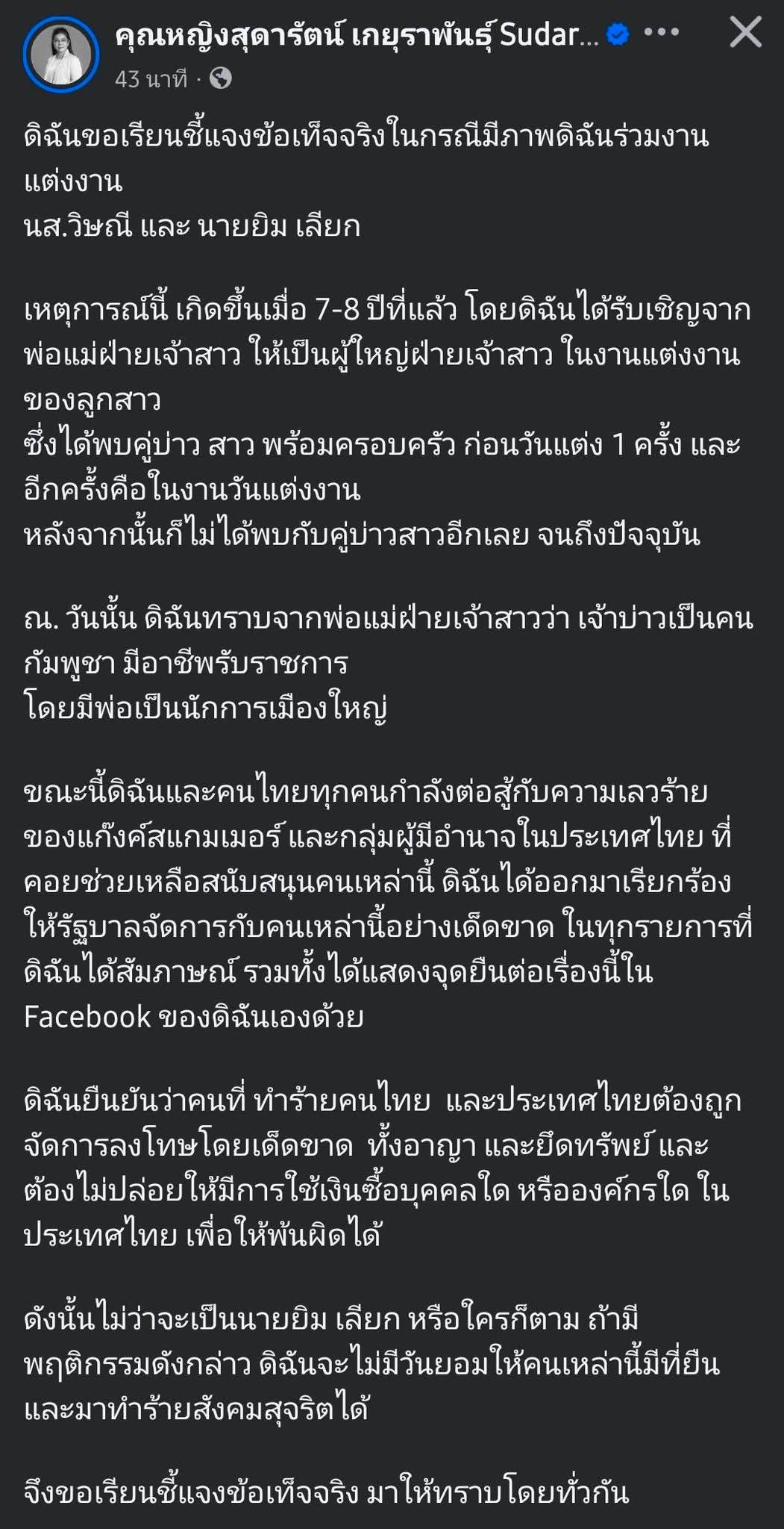หญิงหน่อย สุดารัตน์ เกยุราพันธุ์ หัวหน้าพรรคไทยสร้างไทย ชี้แจงกรณีมีการเผยแพร่ภาพถ่ายที่ปรากฏเธอร่วมงานแต่งงานของ น.ส.วิษณี และ นายยิม เลียก อดีตเจ้าพ่อสแกมเมอร์ โดยระบุว่า เหตุการณ์ดังกล่าวเกิดขึ้นเมื่อประมาณ 7-8 ปีที่ผ่านมา และไม่เคยมีความสัมพันธ์ใดๆ กับคู่บ่าวสาวนับตั้งแต่วันนั้น