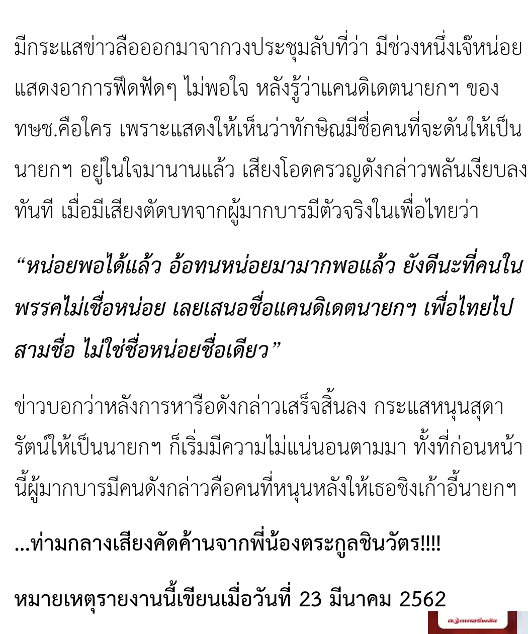 "หน่อยพอได้แล้ว อ้อทนหน่อยมามากพอแล้ว ยังดีนะที่คนในพรรคไม่เชื่อหน่อย เลยเสนอชื่อแคนดิเดตนายกฯ เพื่อไทยไปสามชื่อ ไม่ใช่ชื่อหน่อยชื่อเดียว”