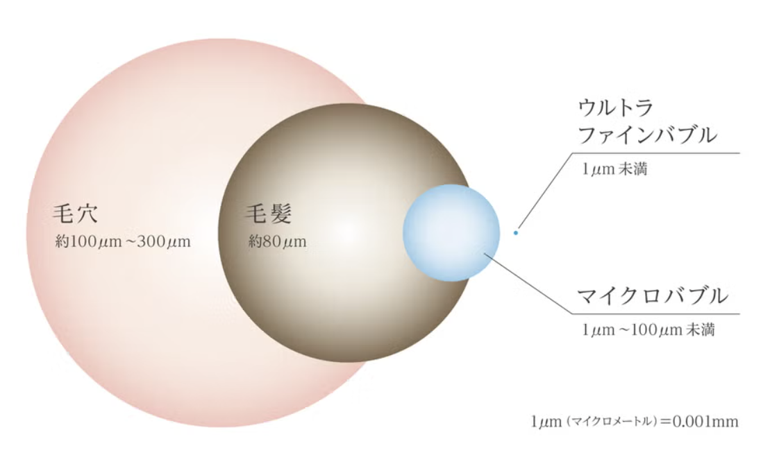 ขนาด 1 ไมโครเมตร ที่ทำให้น้ำมีลักษณะคล้ายละอองหมอก เนื่องจากฟองอากาศนาโนเหล่านี้มีประจุลบ จึงสามารถแทรกซึมเข้าสู่ร่องรูขุมขนเล็ก ๆ ได้อย่างล้ำลึก ง่ายดายกว่าหยดน้ำในฝักบัวทั่วไป
