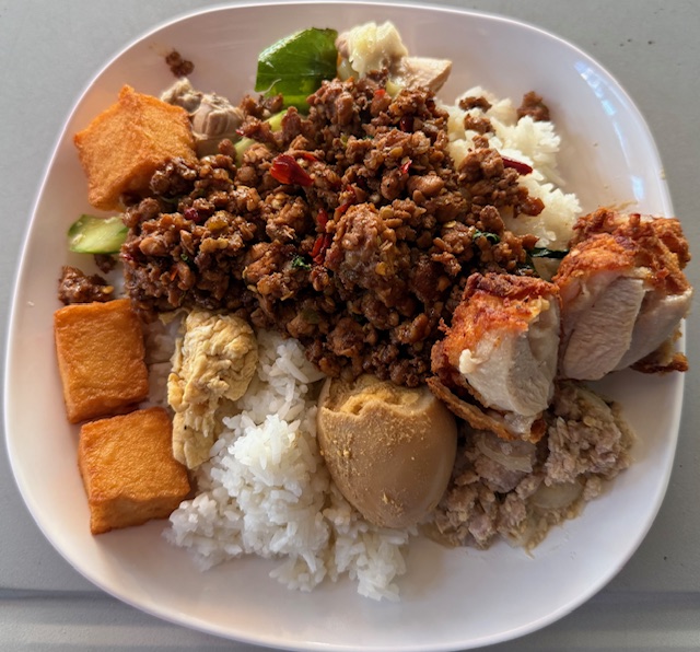 เริ่มด้วยปลาสวายของโปรด ควบปลาดุกของชอบ แล้วข้าวขาหมูอีกสองจาน หมอประจำตัวมองค้อน แต่มันก็อิ่มกำลังดี ตบด้วยของหวานแก้เลี่ยน สบายใจ