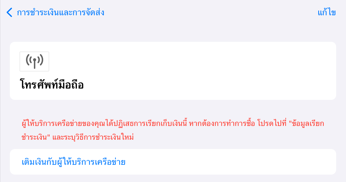 การชำระเงินผ่านซิม Ais ถูกปฏิเสธ - Apple