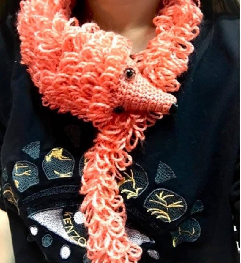 - ถักส่วนลำตัวก่อนเป็นผ้าพันคอยาว แล้วค่อยเพิ่มลายละเอียดตรงส่วนหัวและหาง