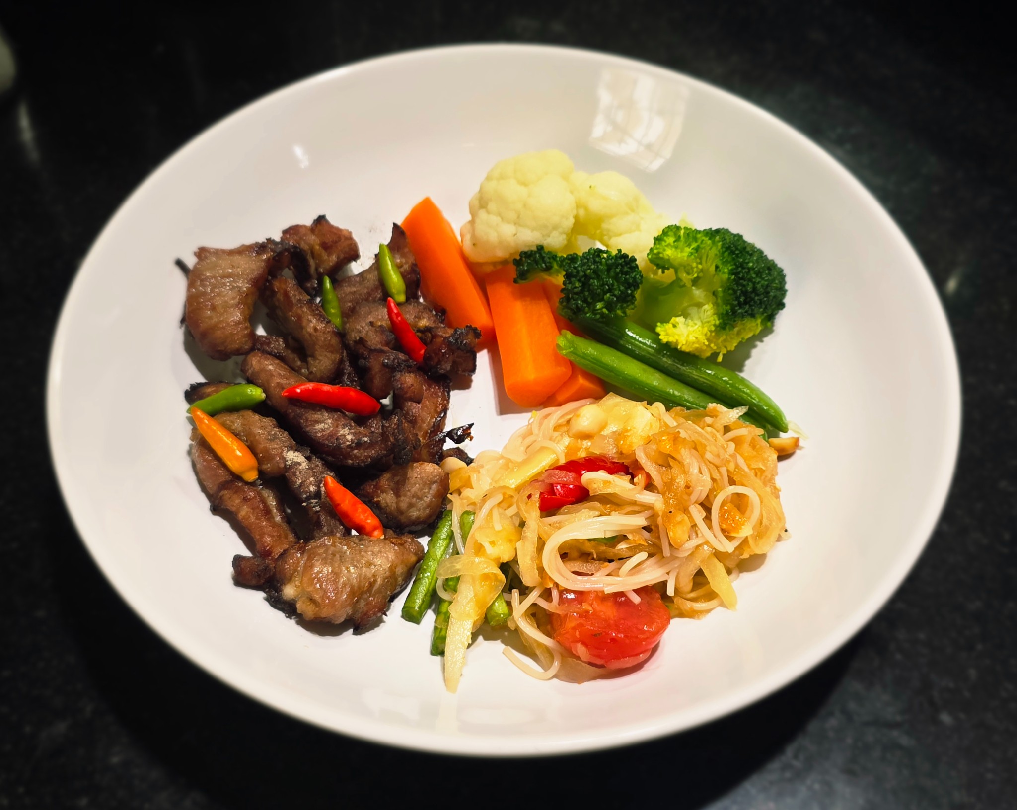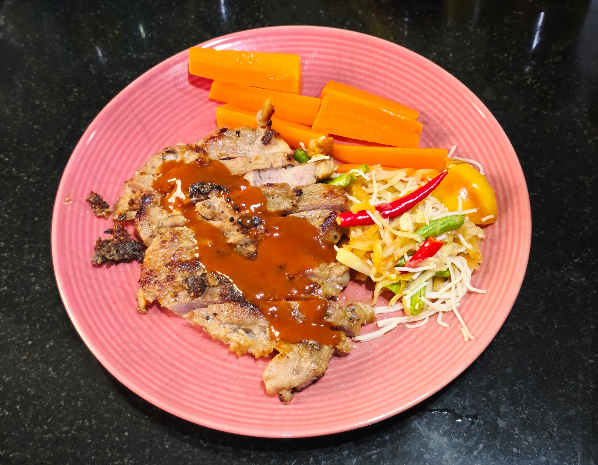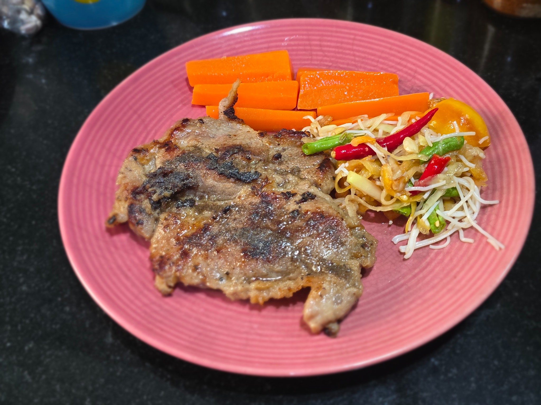 ช่วงวันหยุด เมนูลดแป้ง ง่ายๆ เลย สำหรับผม ก็เป็น หมูทอดน้ำปลา & สเต็กหมู กินพร้อมกับส้มตำและผัก กินได้เป็นอาหารและกับแกล้ม