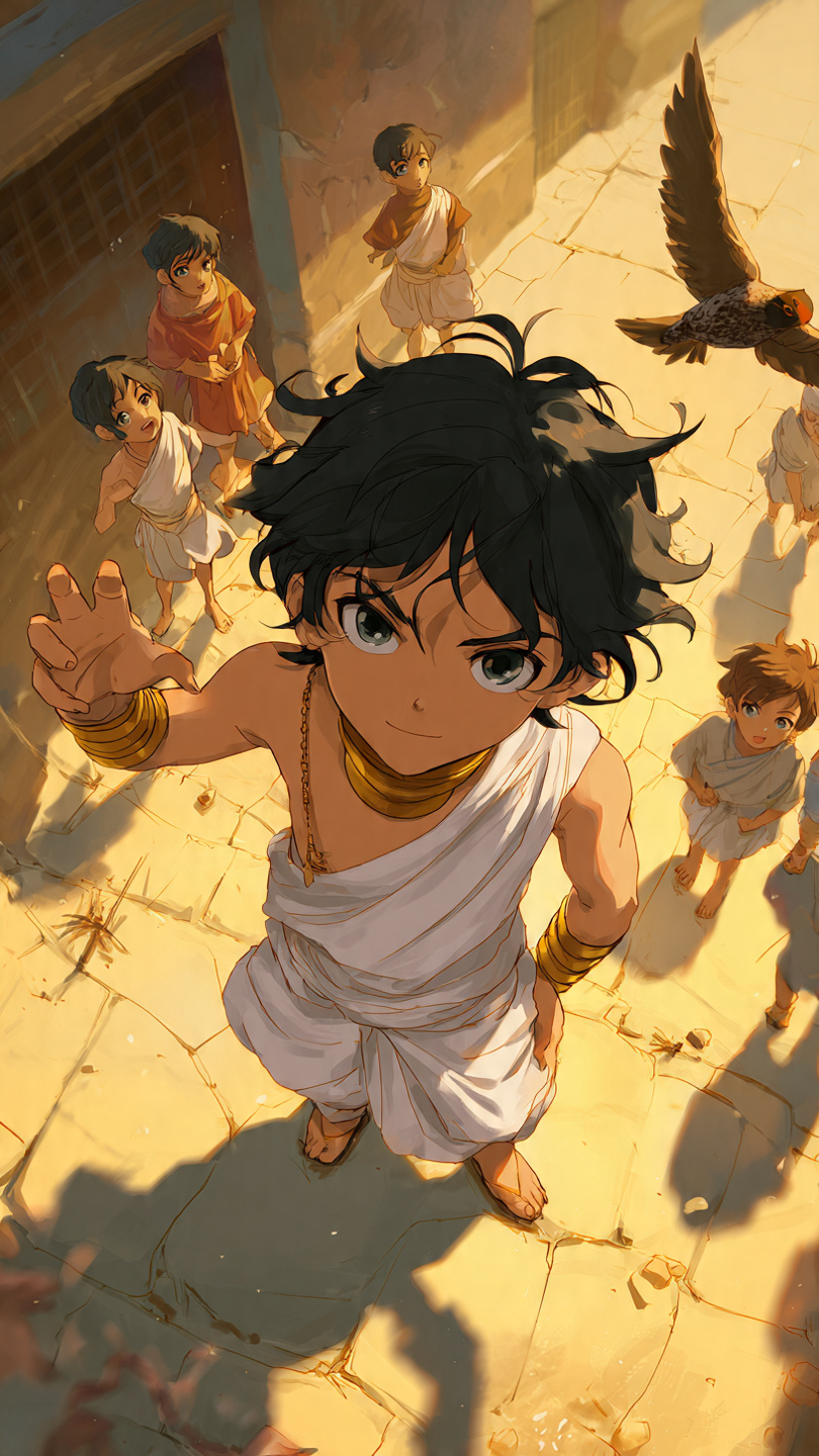 เสียงโห่ร้องของเด็กๆ ดังก้องไปทั่วสนามเล่น มโหสถหันมามอง เห็นเหยี่ยวตัวหนึ่งคาบชิ้นเนื้อบินผ่านท้องฟ้า พวกทารกวิ่งไล่ตามพลางมองขึ้นฟ้า ล้มลงกองกันเพราะสะดุดตอไม้และหิน