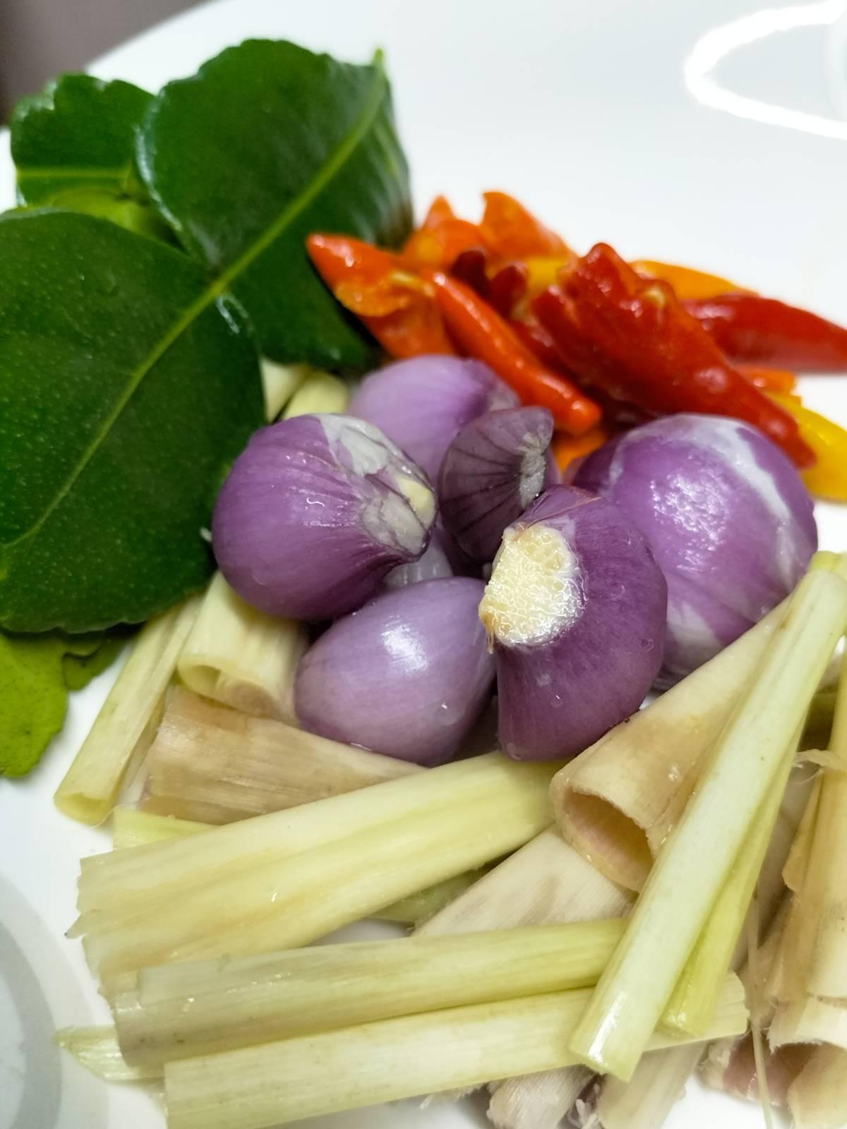 1. ตั้งหม้อให้ร้อน ใส่ตะไคร้ ใบมะกรูด หอมแดงบุบ พริกขี้หนูบุบลงไป