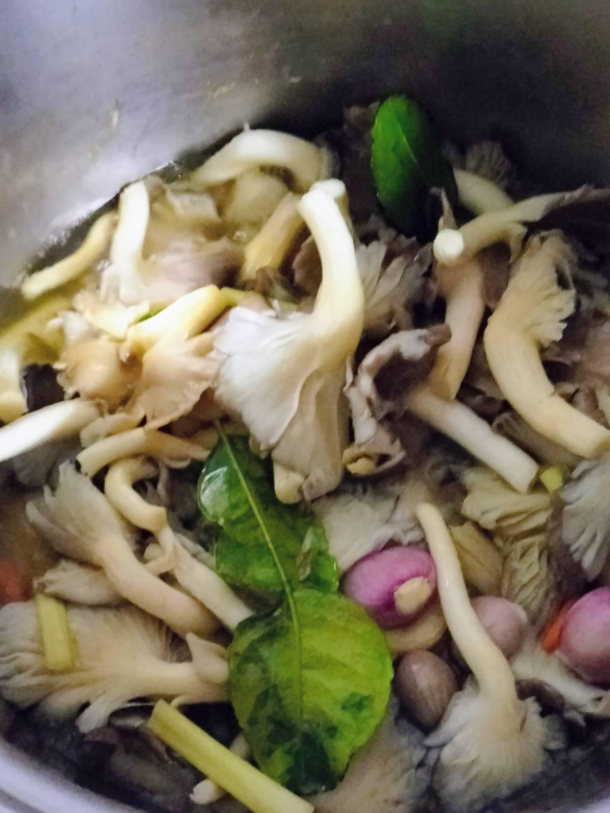 2.นำเห็ดที่ล้างสะอาด ฉีกเป็นชิ้นพอดีคำ ใส่ลงหม้อพร้อมเครื่องสมุนไพร จากนั้นลดไฟลง ใช้ไฟอ่อน ปิดฝาหม้อ