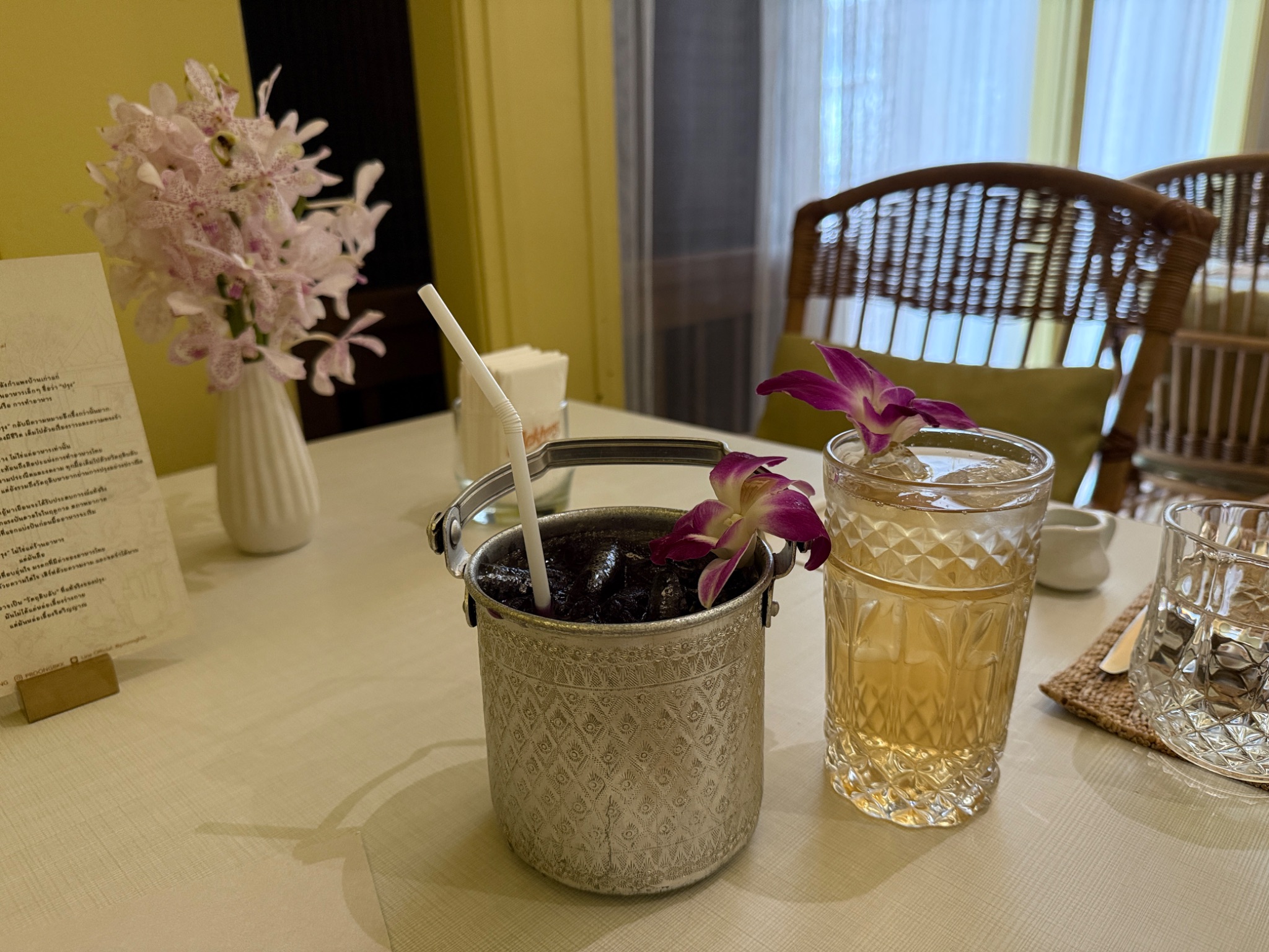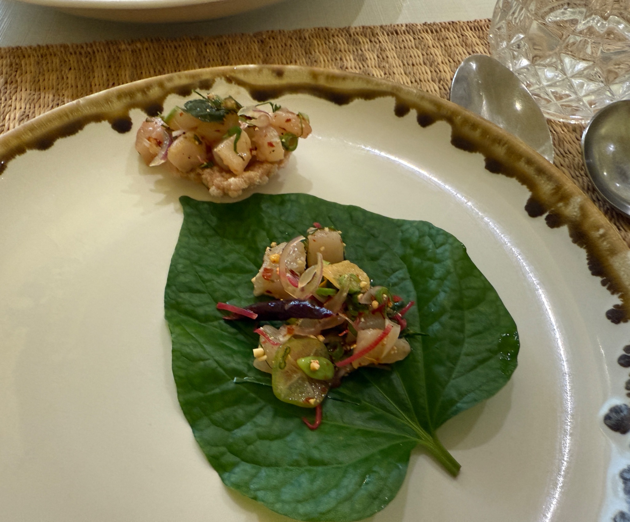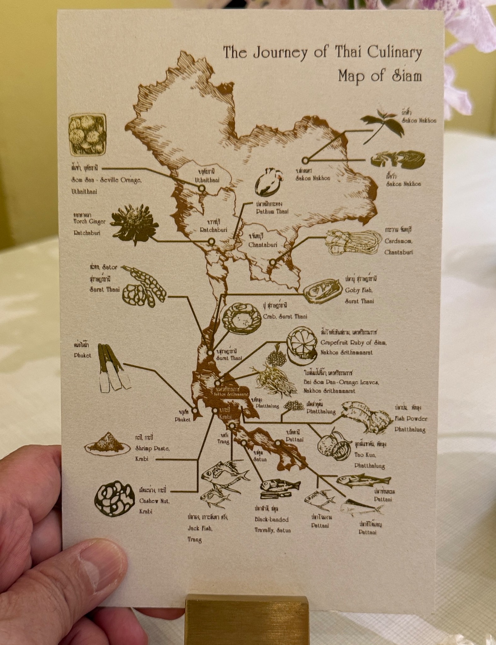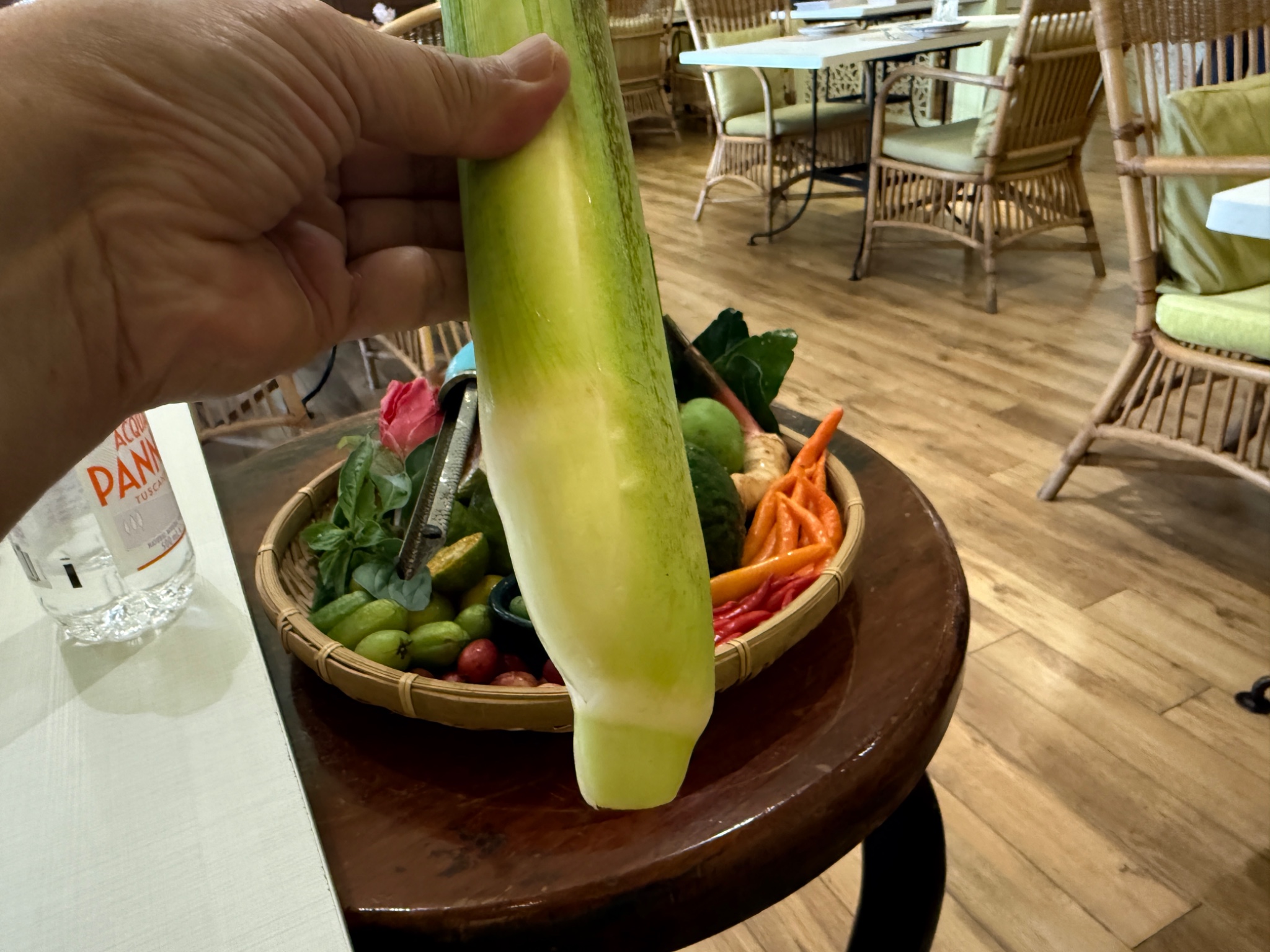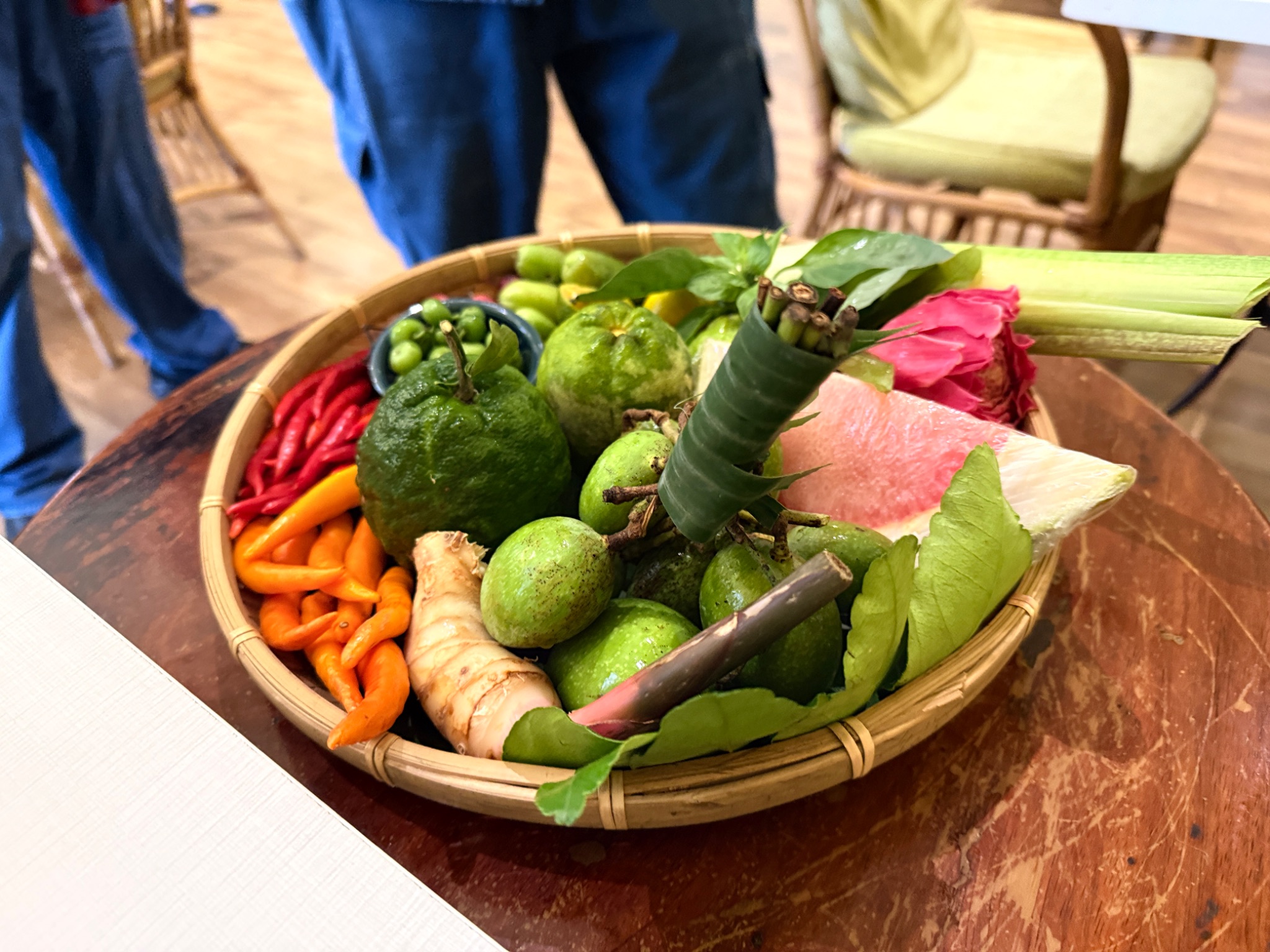 ก่อนเริ่มเสริฟ อาหาร มีพนักงานนำวัตถุดิบ ที่ปรุงสำรับไทย มาให้ดู และอธิบาย หลายอย่างรู้จักดี เช่นโหระพา ส้มซ่า มะกรูด ส้มจี๊ด ตะลิงปิง มะม่วงเบา มะม่วงหาวมะนาวโห่ (miracle fruit)  ส้มโอ โหระพา ใบชะพลู พริกเหลือง ดอกดาหรา ข่า