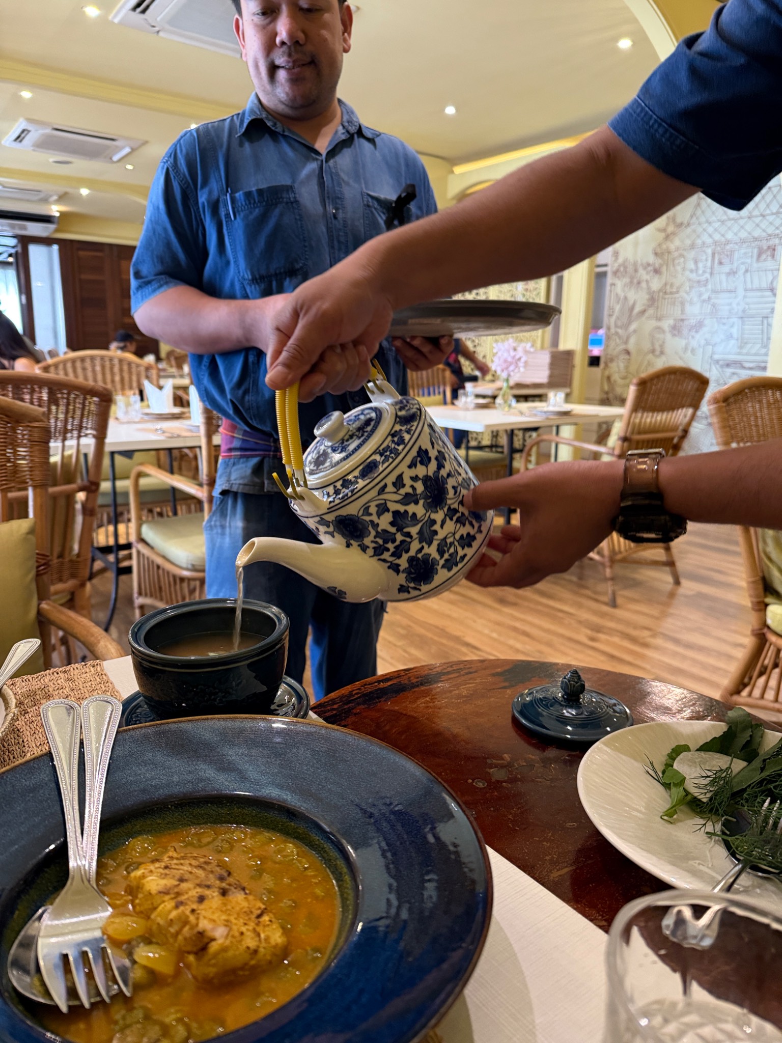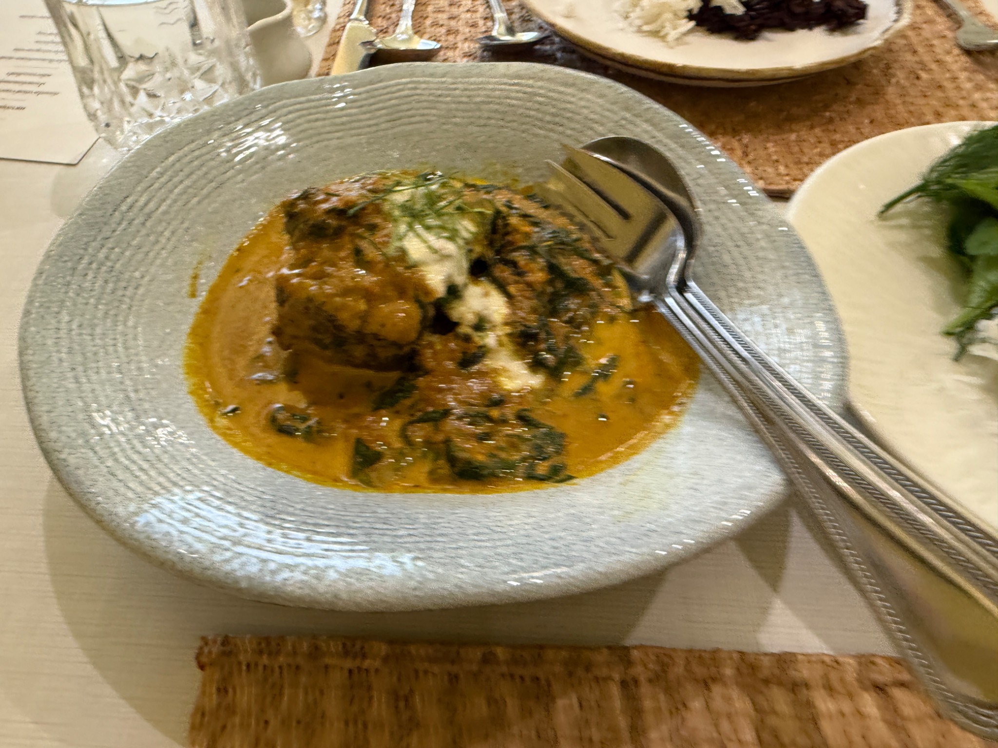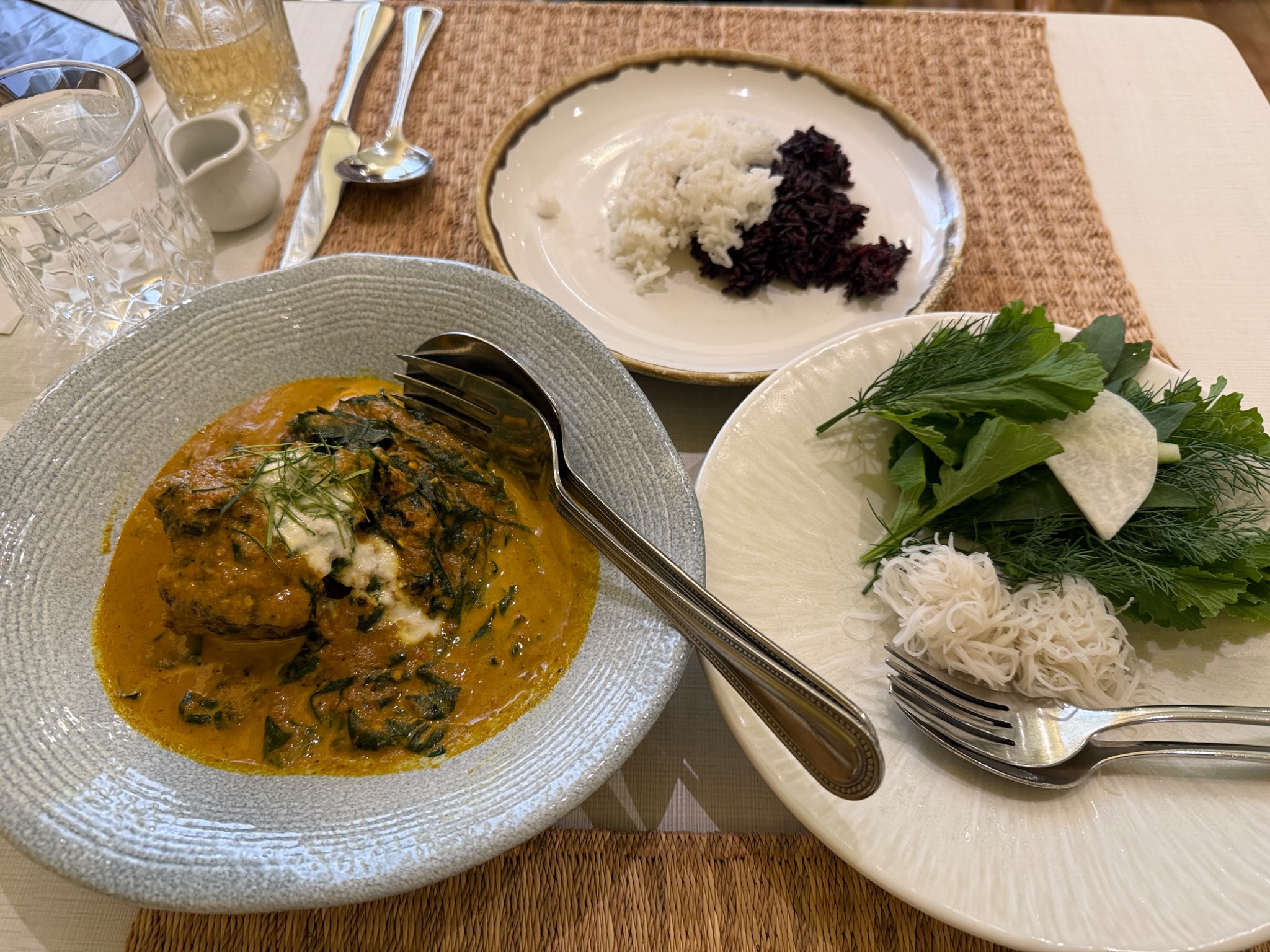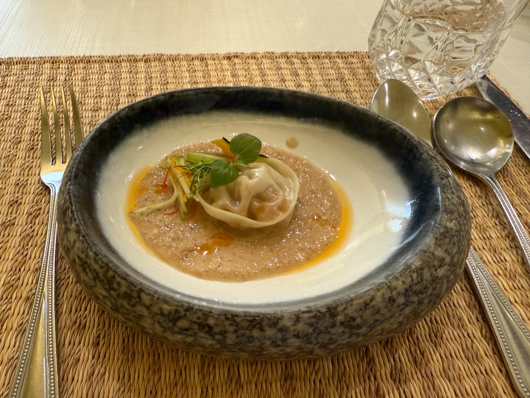 เมนูนี้หน้าตาคล้ายเกี๊ยวกุ้งเสริฟมา ในซอร์สคล้ายมัสหมั่น แต่จริงๆ คือหลน แต่ไม่เค็มนะ ออกหอมนัวมัน อร่อย ชอบ ขนาด อยากขอสั่งเพิ่มเลย
