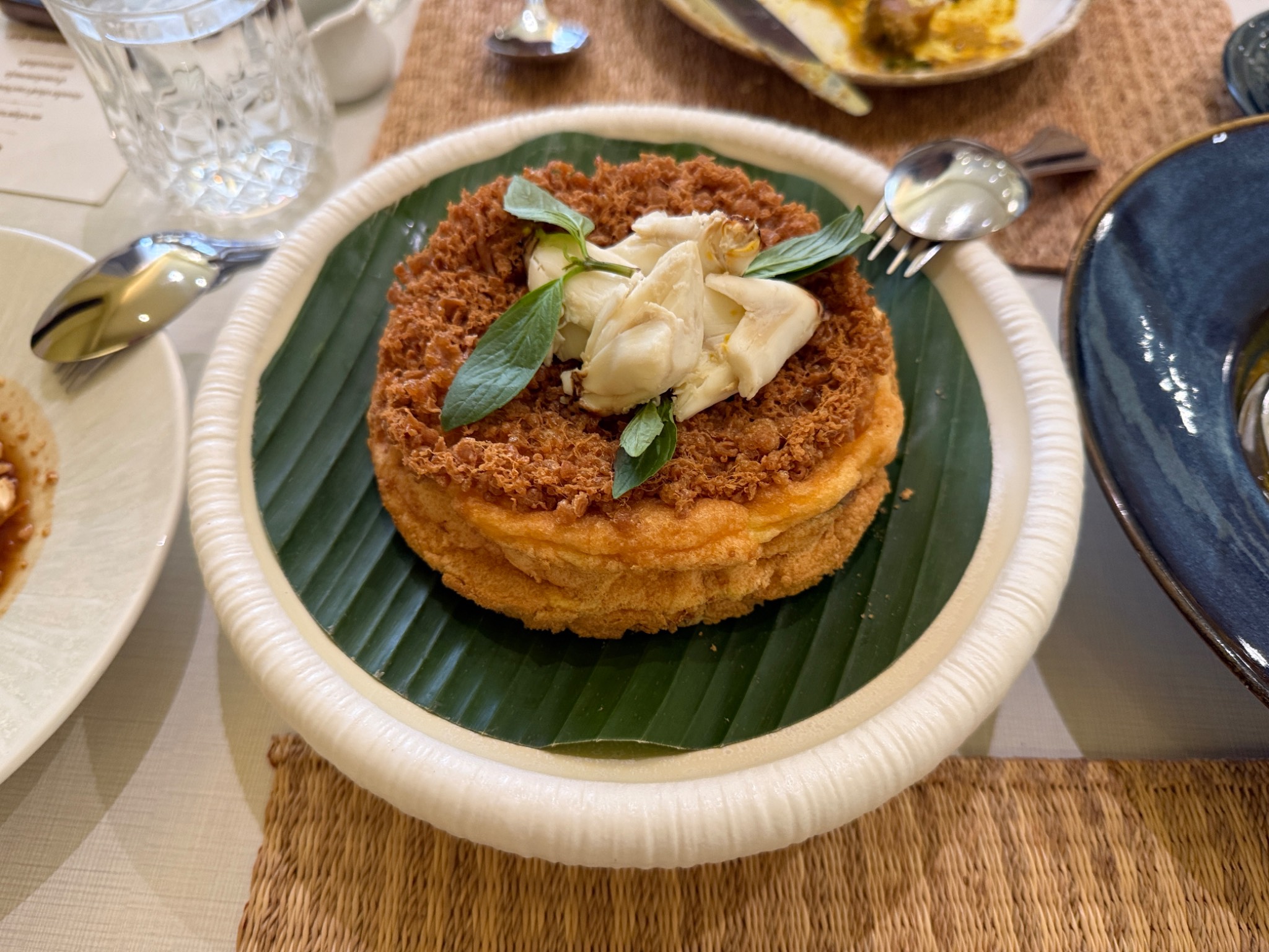 เมนูนี้มาทรงไข่คอนโด เหมือนก้อนเค็ก ก้อนโต เนื้อไข่ส่วนล่างเนียนนุ่มมีโหระพาที่กลิ่นไม่แรงมาก ผสมมา และด้านบนTopด้วยไข่ฟูกรอบ โรยหน้าปู ทานกับน้ำจิ้ม พริกน้ำปลา ตะลิงปิง และกระเทียมสด กินกับแกงคั่วก้ออร่อย