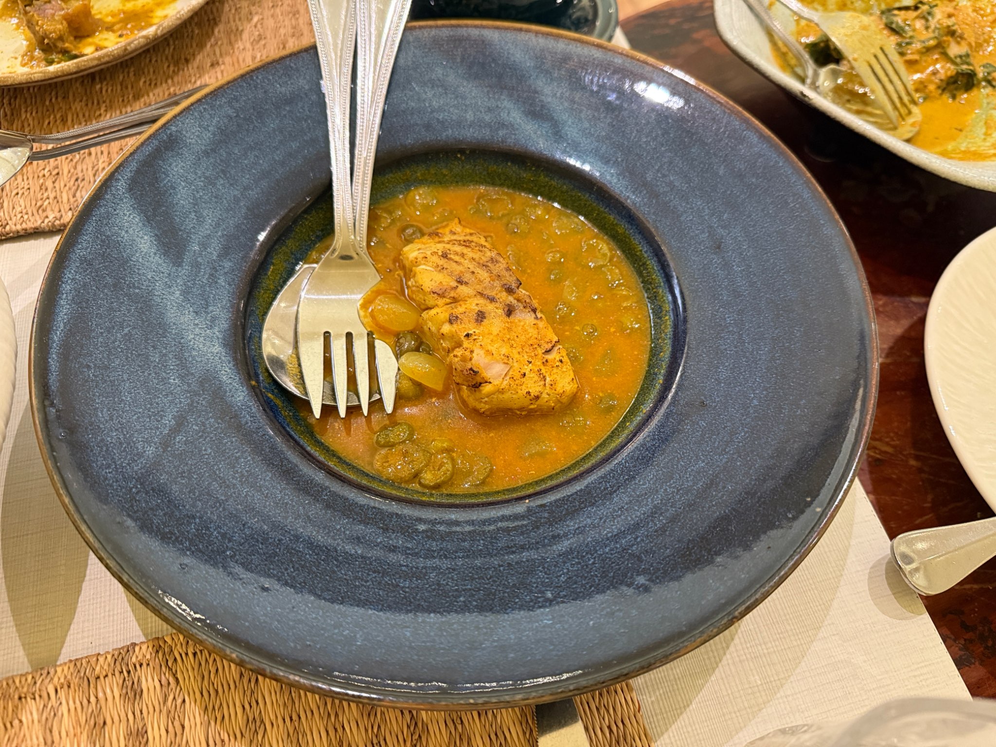 จานนี้ใช้ปลาโฉมงามทำแกงส้มรสเข้มข้น ใส่ลูกเถาคันที่ออกรสเปรี้ยว และมีลูกโช้ค(ลูกชิด)มันหนึบๆ เนื้อปลาดี อร่อย