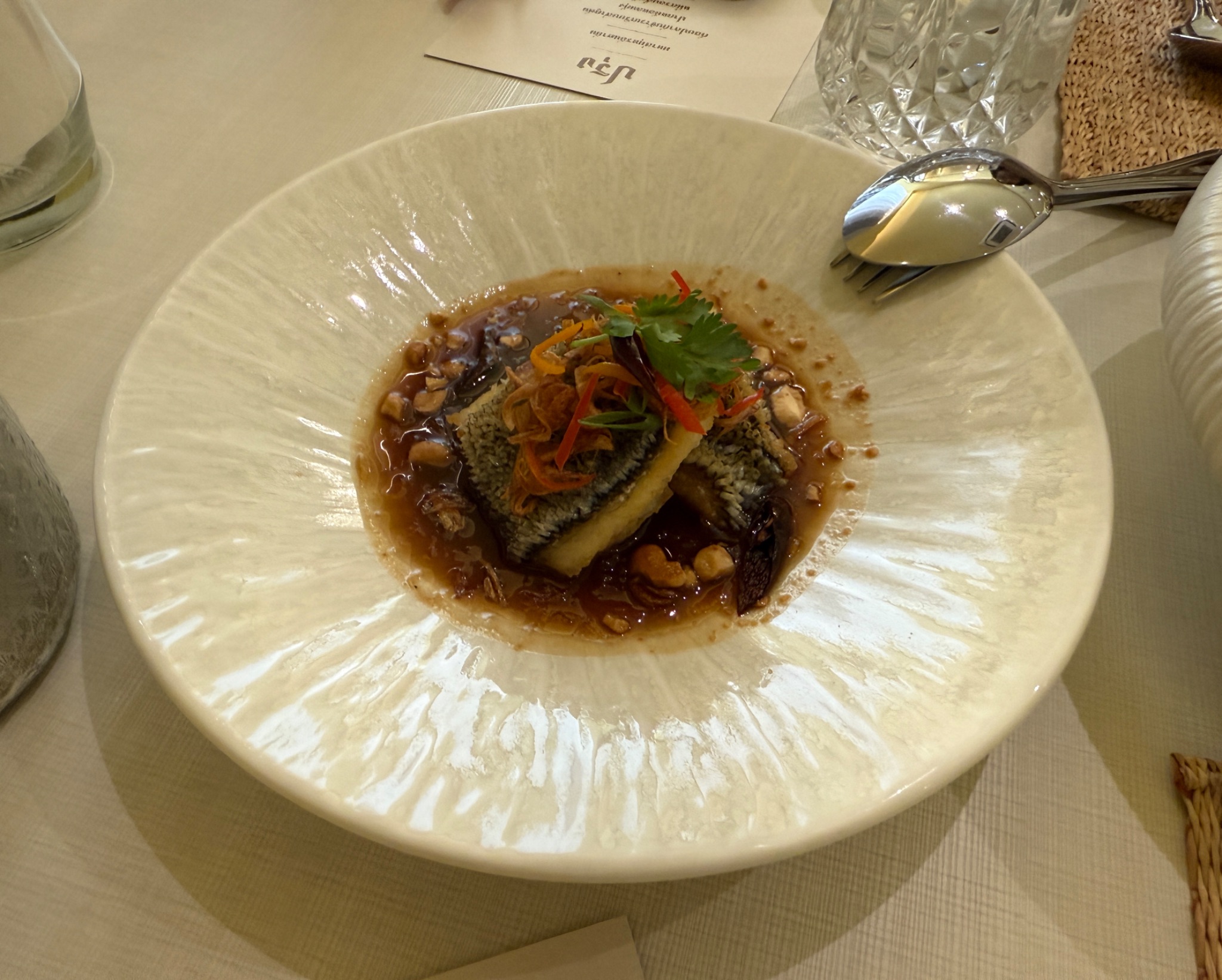 คอร์สนี้ เป็นเนื้อปลาช่อนทะเลดิบ กับซอร์สพริกเหลืองส้มซ่า รสออกเปรี้ยวเผ็ด ปลาสดเด้ง ว้าวววว มาก อร่อยแบบตะโกน เลย