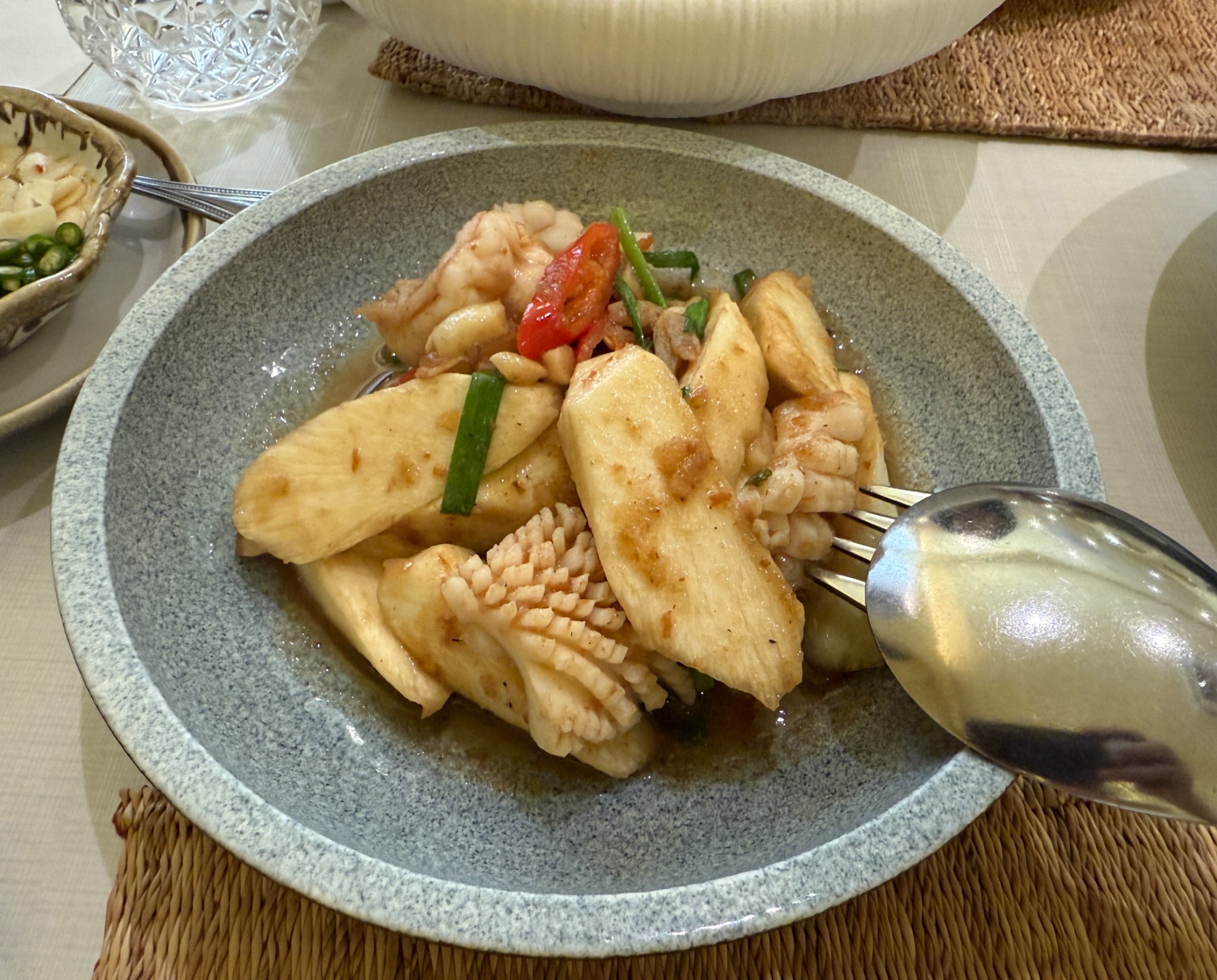 เมนูนี้เป็นครั้งแรกที่กินหน่อไม้น้ำ( กะเป๊ะ)จากภูเก็ต ลักษณะ มันดูคล้านเห็ดออเรินจิ แต่ Texture และรสชาติมันจะกึ่งระหว่างพวกยอดมะพร้าวกับเห็ดออเรนจิ  จะออกค่อนข้างกรอบ หวาน อร่อย ส่วนเคย กุ้งหมึกกระดอง ก้อหอม ทานกับข้าวสวย อร่อย
