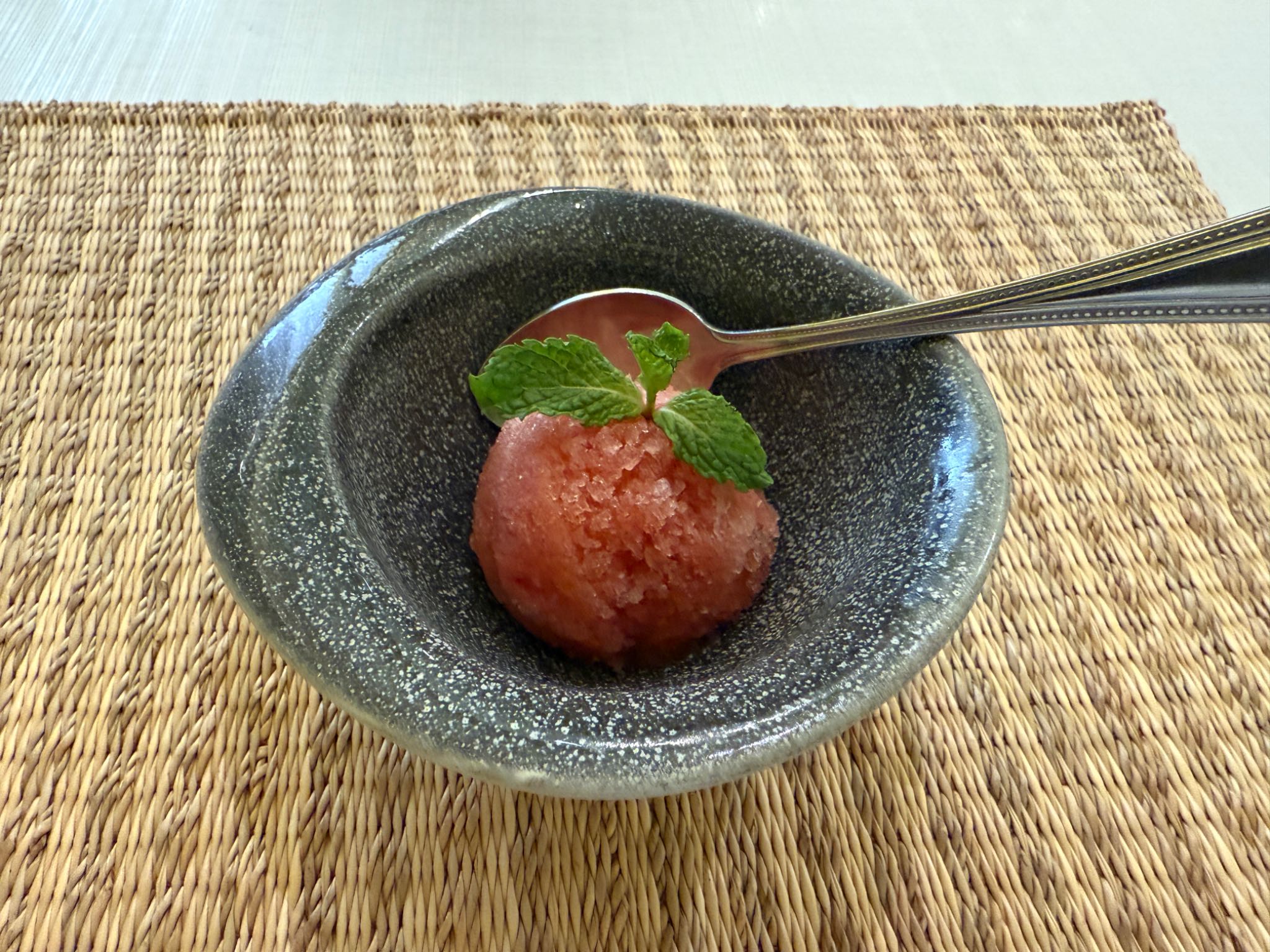 เมนูนี้เป็น Granita หรือเกล็ดน้ำแข็งใส่แตงโมและดอกดาหลาปั่น คล้าย sorbet ล้างปาก สดชื่น