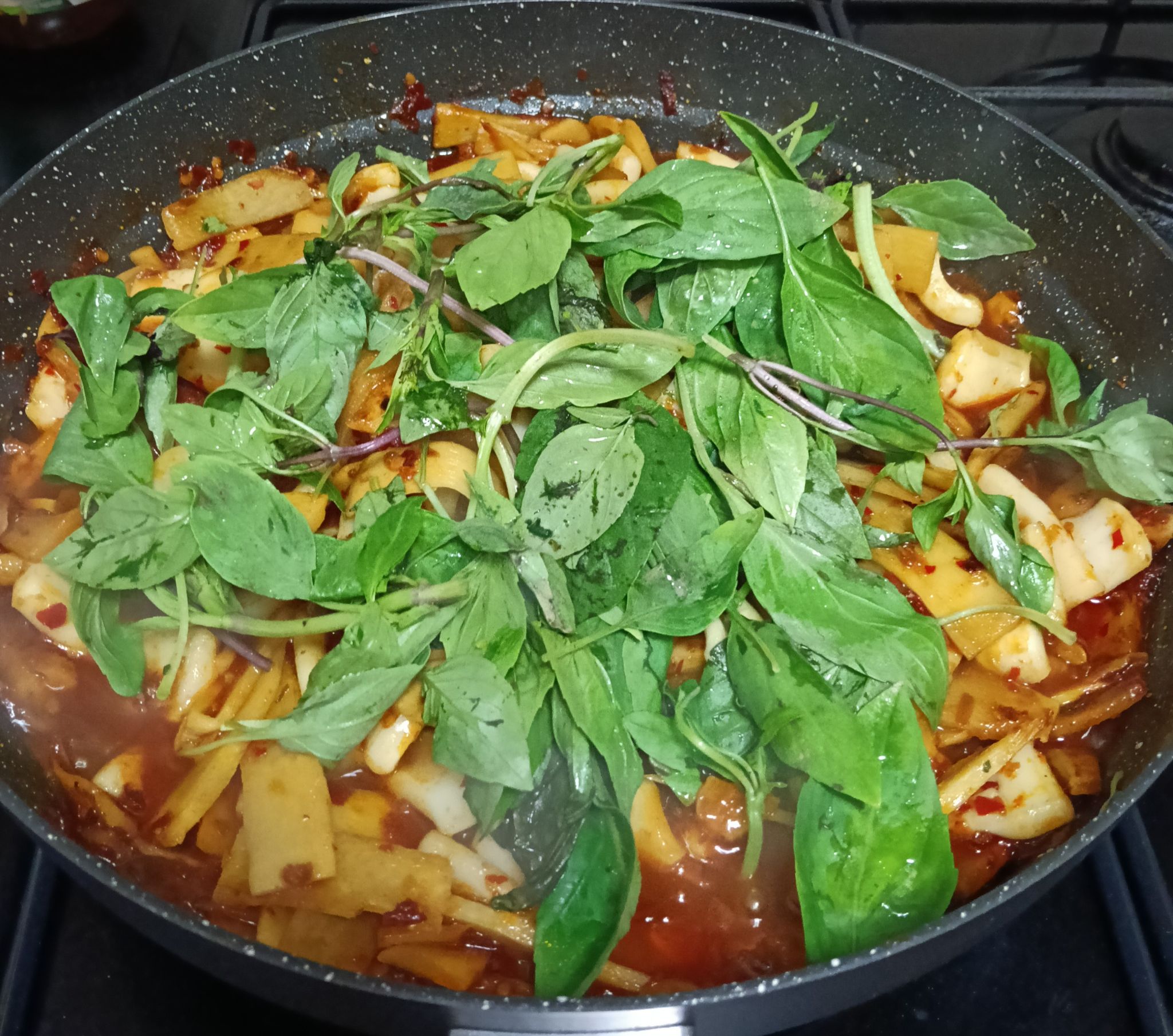 ผัดให้ทุกอย่างเข้ากัน แล้วตามด้วยใบโหระพา ปิดเตา ใช้ตะหลิวตะหลบๆใบโหระพาให้ลงไปด้านล่าง เพื่อไม่ให้ใบโหระพาช้ำ