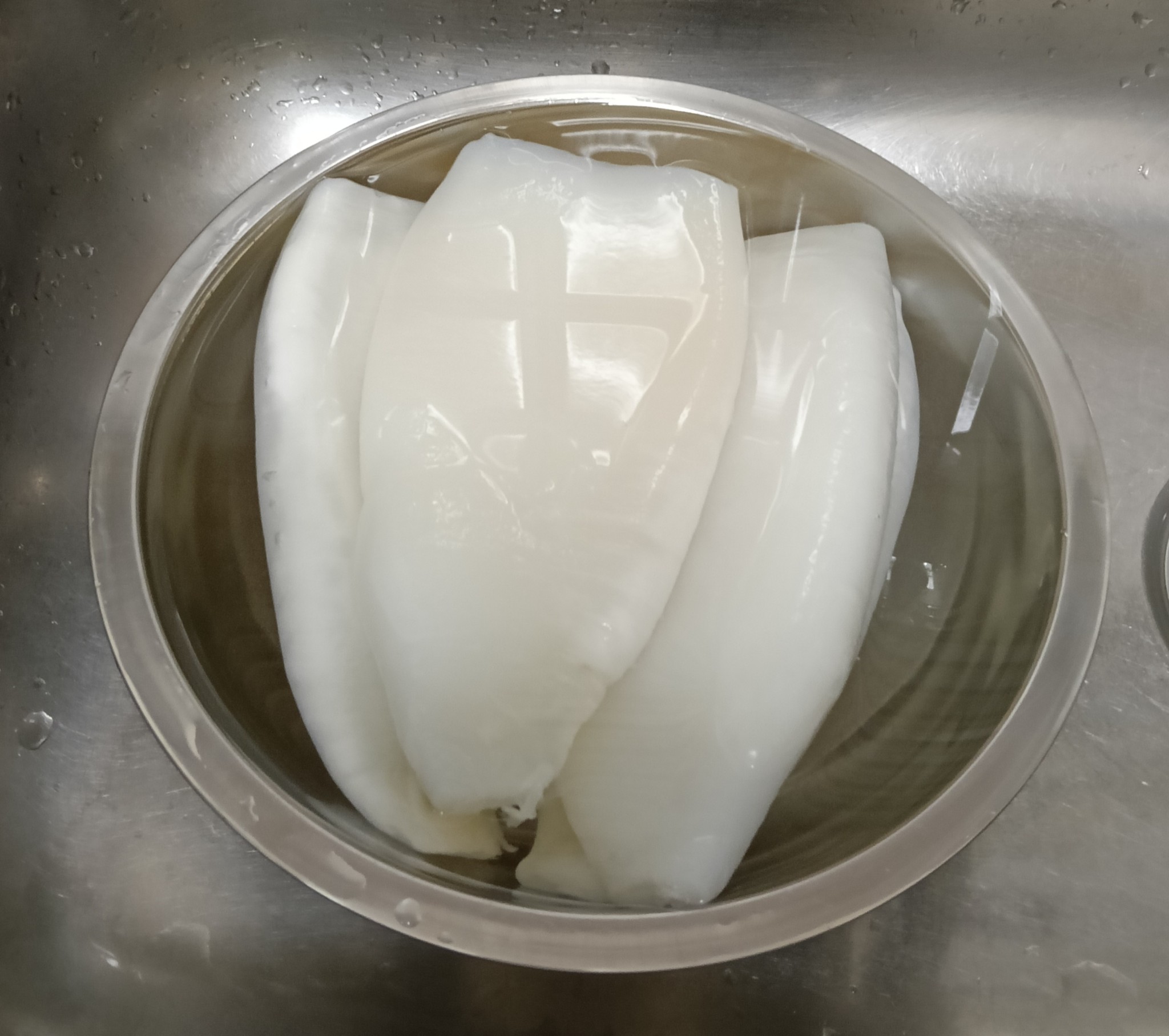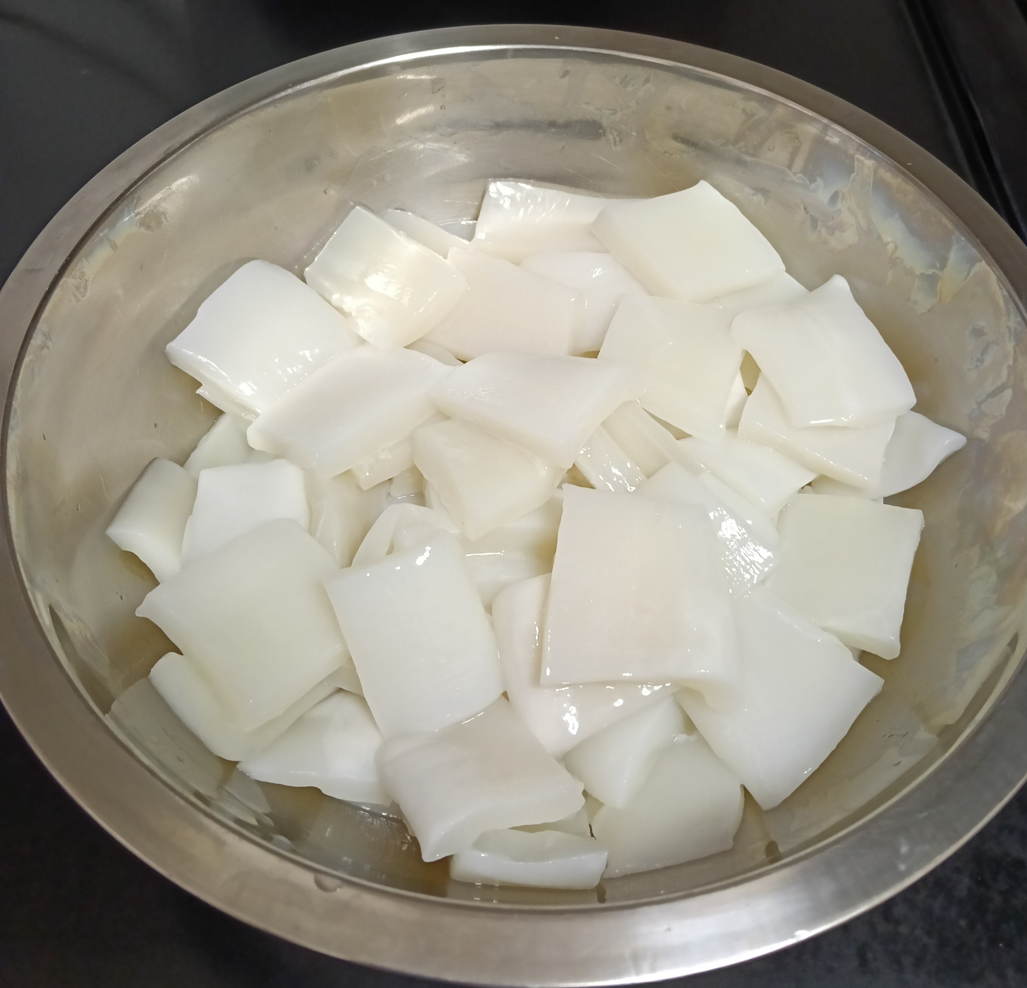 ล้างปลาหมึกให้สะอาด หั่นเป็นชิ้นสี่เหลี่ยมพอดีคำ