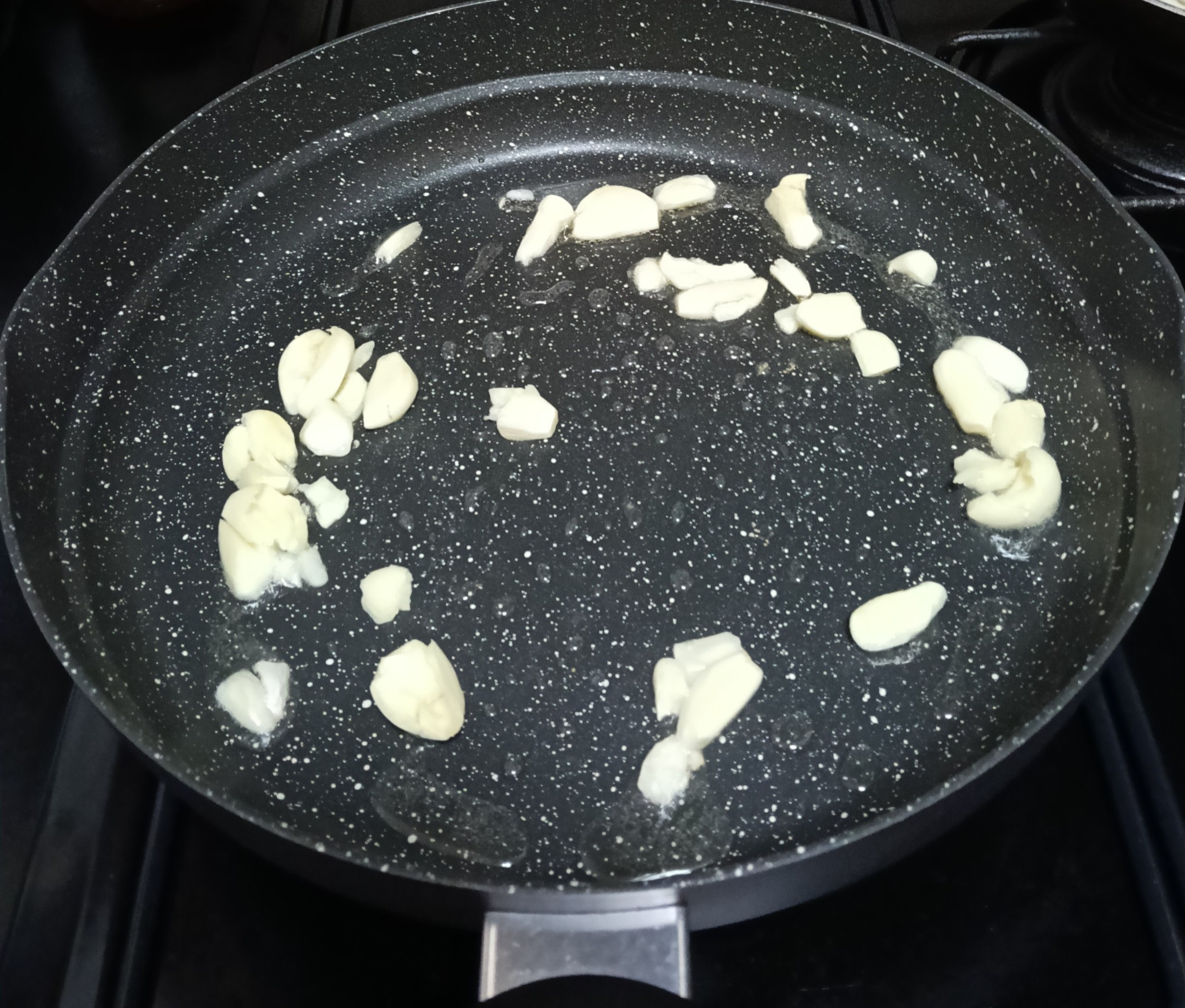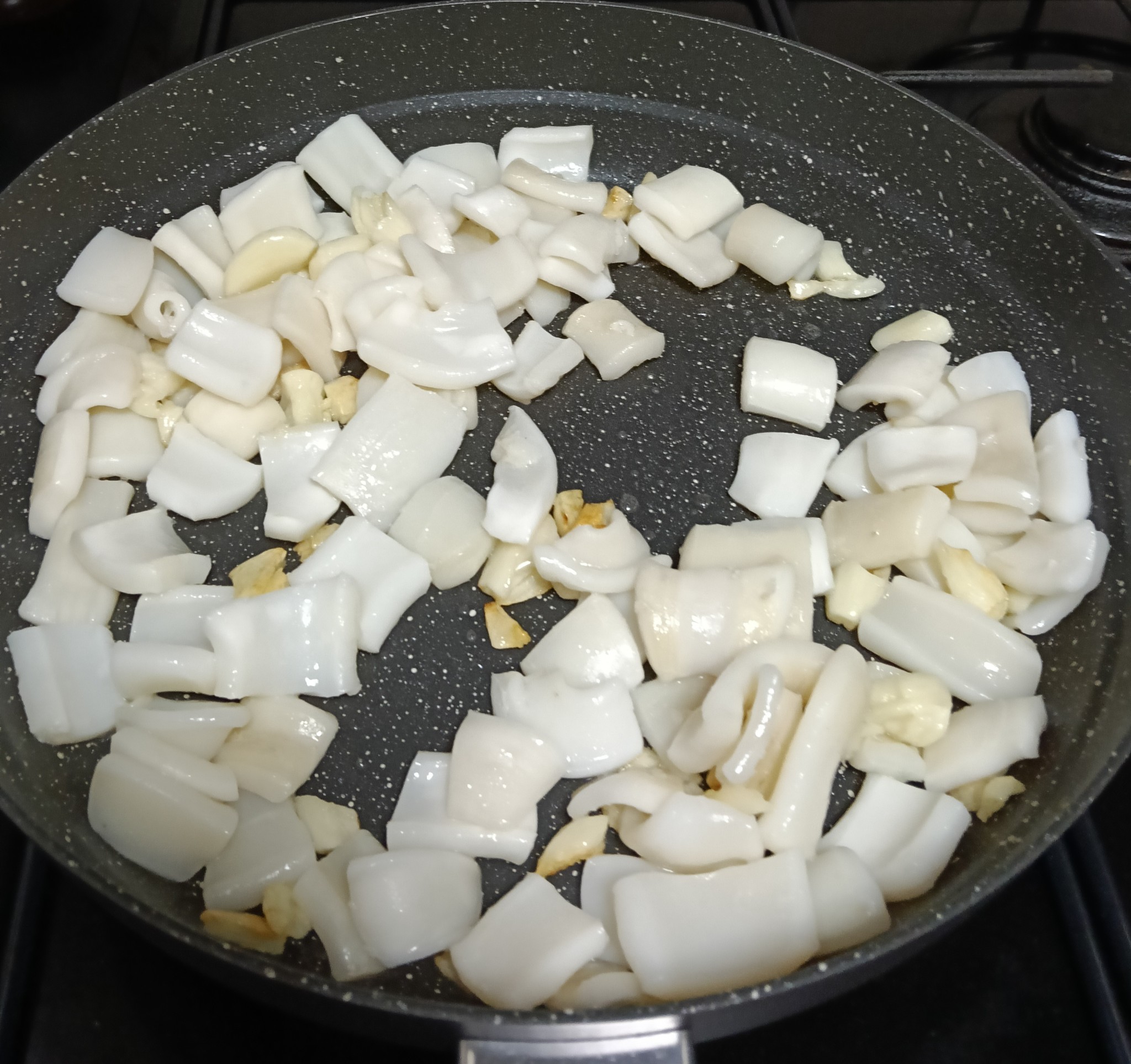ตั้งกระทะให้ร้อน ใส่น้ำมัน  ใส่กระเทียมลงไปผัดให้หอม แล้วใส่ปลาหมึกลงไปผัดให้พอสุก ตามด้วยหน่อไม้ (วันนี้ขี้เกียจหน่อย กระเทียมทุบๆเอา ไม่ได้สับให้ละเอียดเลย อิอิ)
