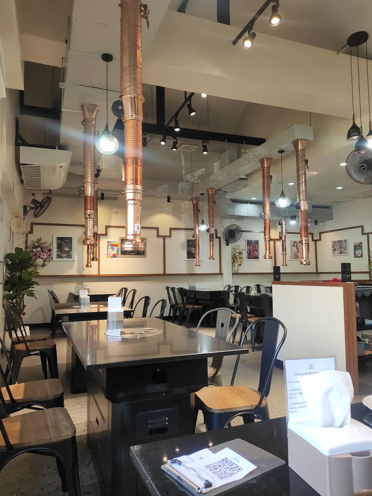 บรรยากาศในร้านจะเหมือนอยู่ในบ้าน มีบาร์ให้ตักน้ำจิ้ม ซุป และน้ำดื่มอยู่ตรงกลาง