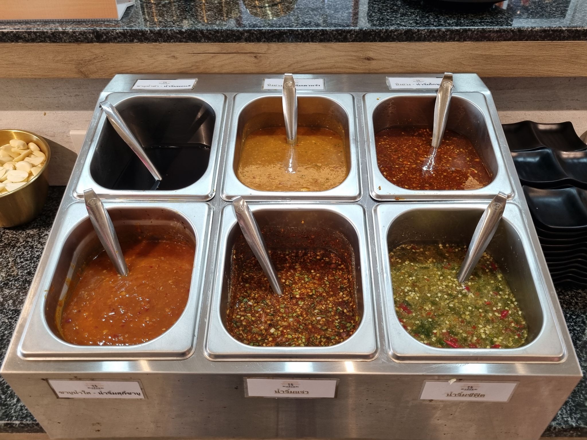 น้ำจิ้มก็มีให้เลือกหลายแบบครับ แยกไว้แล้วสำหรับ เมนูต้ม ย่าง กับของทะเลซึ่งก็คือพวกกุ้ง หมึก นั่นเอง
