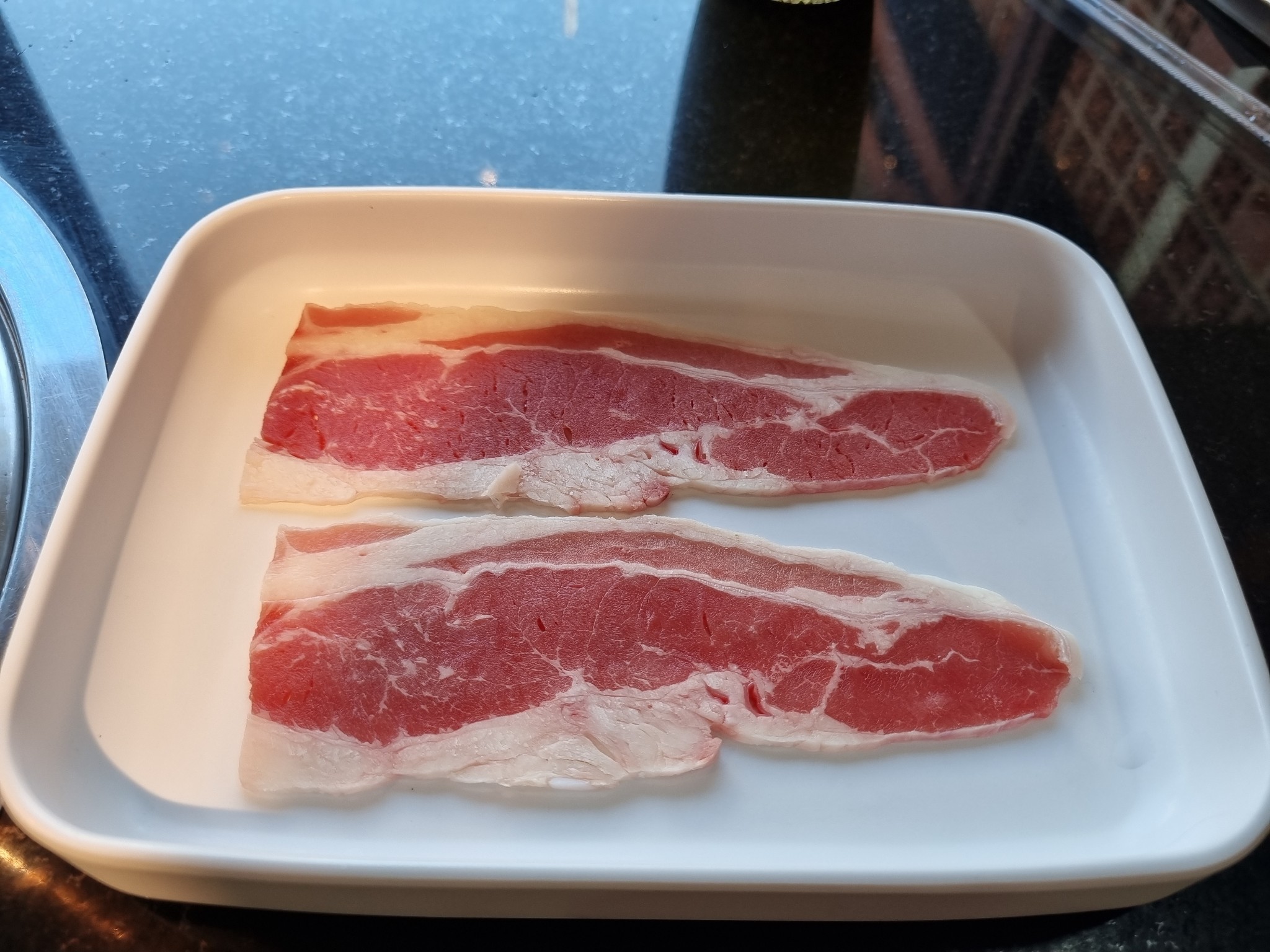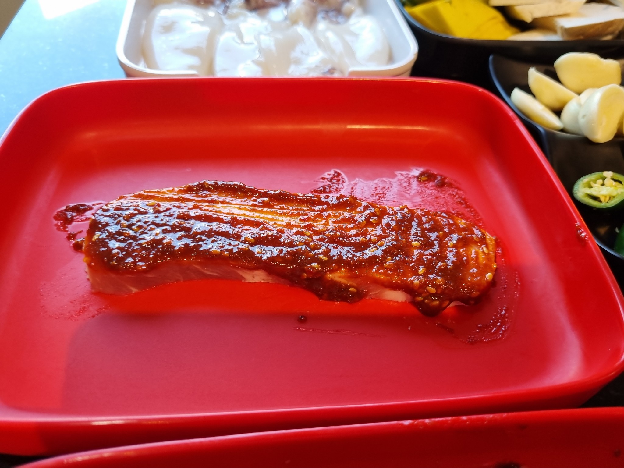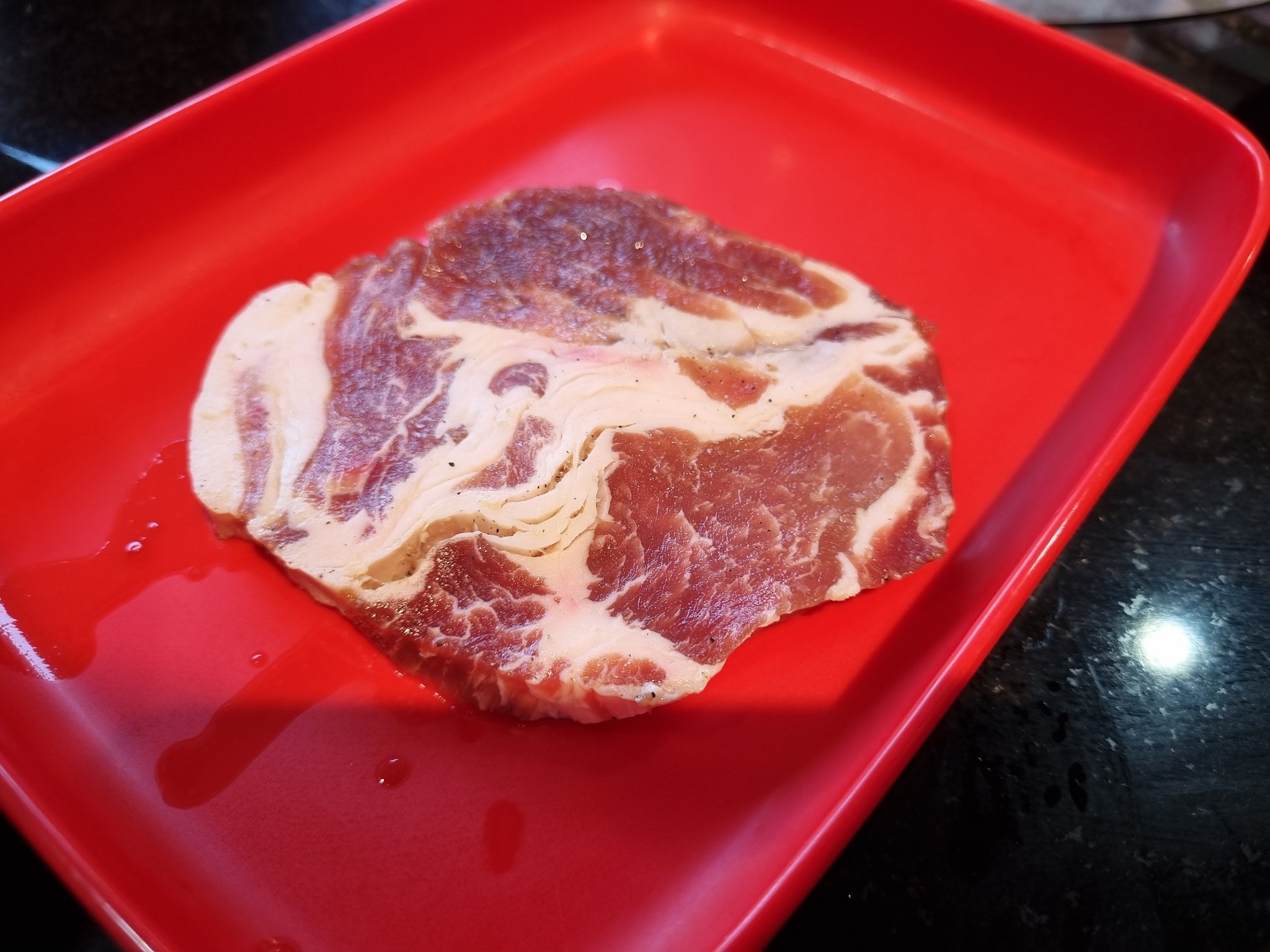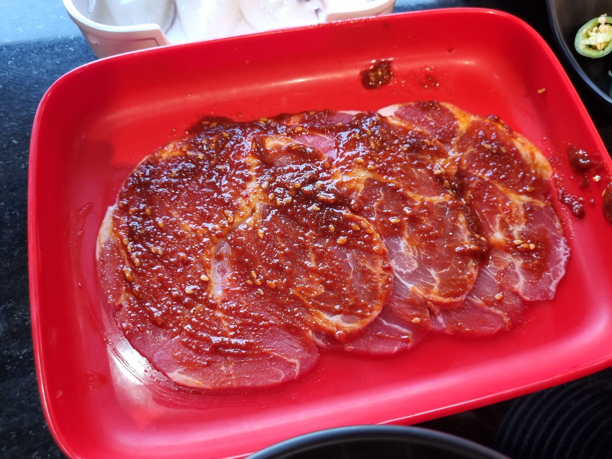 เริ่มปิ้งเนื้อกันด้วย สันคอโคชูจัง ไม่รู้ว่าทำไมได้ชิ้นแบบบางมานะ ปกติแบบย่างต้องหนาสิ แต่ที่รู้ๆคือเนื้อนุ่มดี รสหอมซอสโคชู ก็ถือว่าใช้ได้อยู่