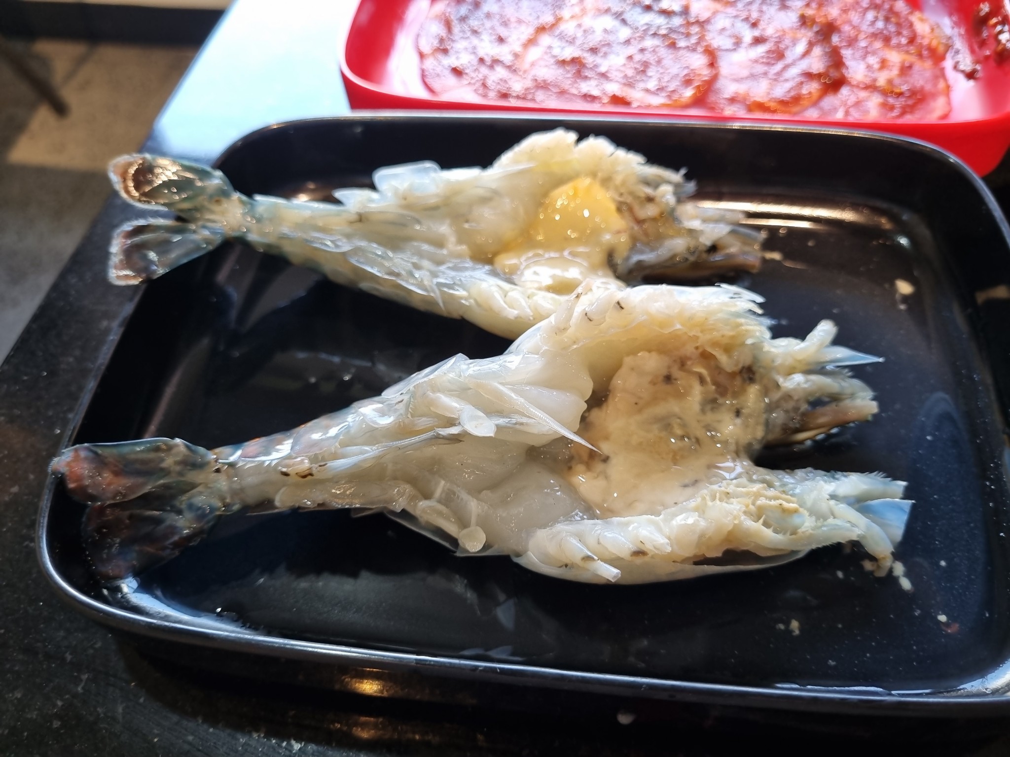 กุ้งแม่น้ำผ่า สุกยากมาก กินเนื้อไปจนหมดเตานึงแล้ว เปลือกยังไม่ส้ม เลยต้องอาศัยยกออกมาทีนึงแล้วแกะเปลือกออก ค่อยจี่ไฟอีกรอบถึงจะได้กิน