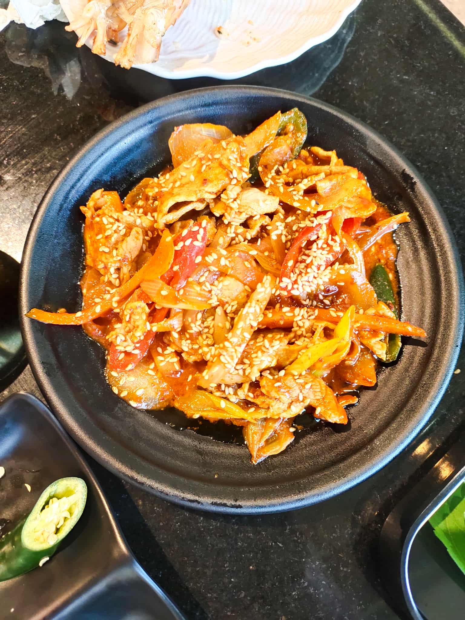 กับเมนูส่งท้าย หมูผัดเจยุกปกกึม เนื้อหมูแห้งยังกับเนื้อไก่ รสแบบซุปรามยอนแต่เผ็ดน้อยกว่า