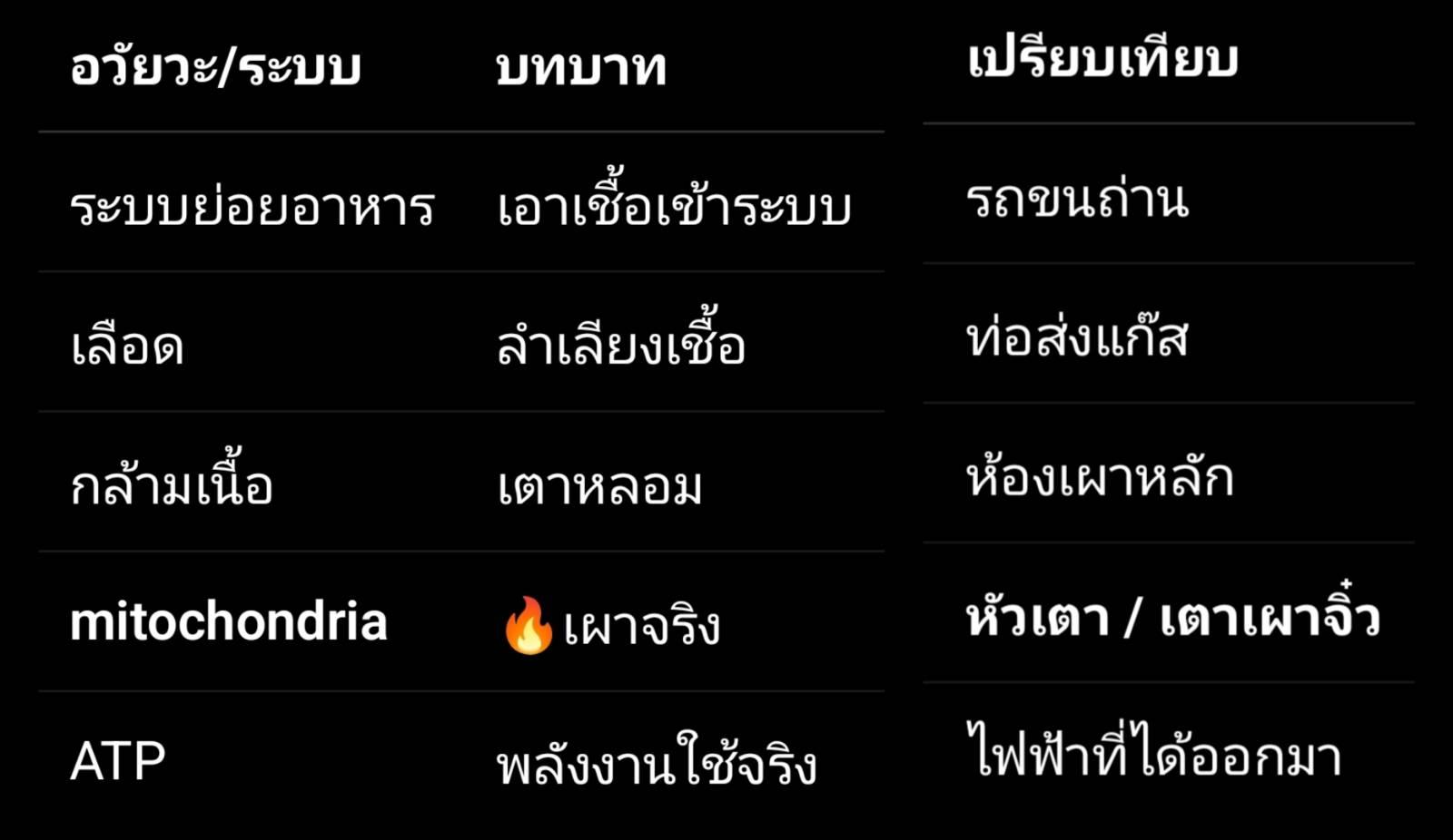 🔥 เตาหลอม/โรงงานพลังงาน → เผาผลาญกลูโคส + ไขมัน ผ่าน mitochondria