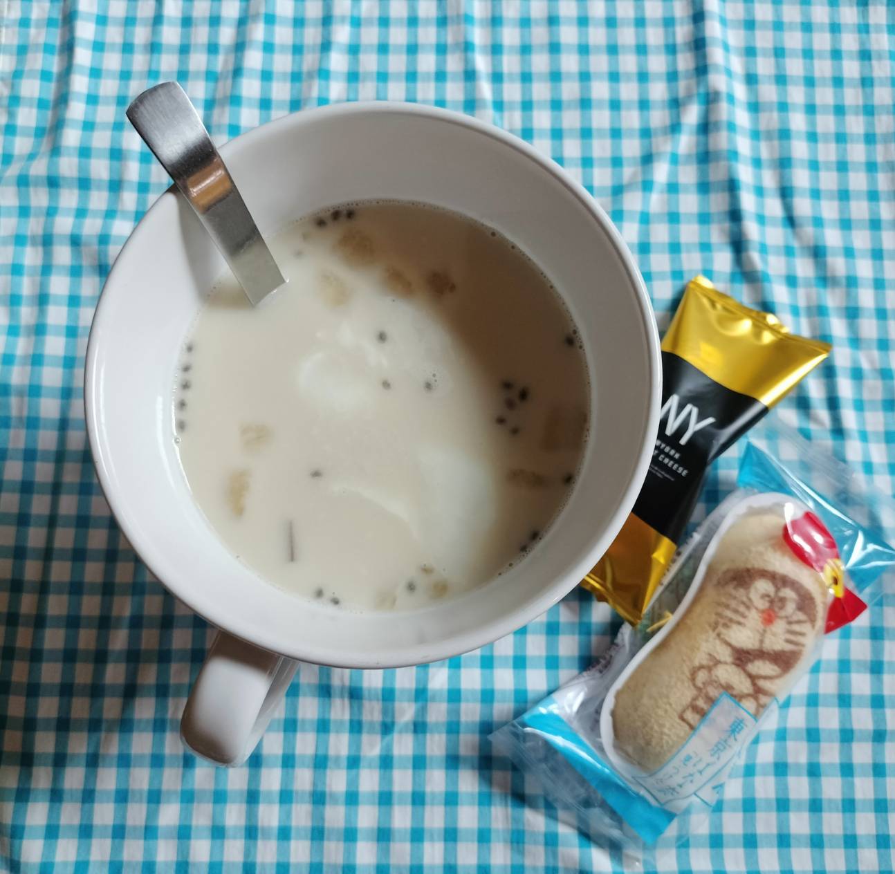มื้อเช้าวันนี้หยิบถุงน้ำเต้าหู้ใส่เครื่องออกมาอุ่นร้อน แล้วหย่อนไข่ลวกลงไปหนึ่งฟอง แถมขนมอีกอย่างละชิ้น