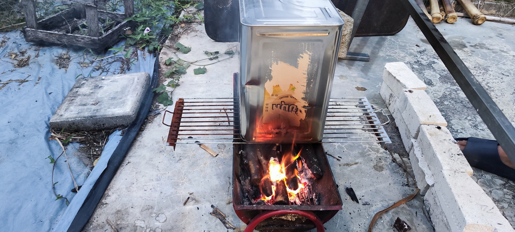เมนูแนะนำจากพี่ๆในพันทิป ที่จดไว้เลยว่าต้องทำให้ได้ ว่าแล้วก็ไปเอากิ่งไม้ประดูที่ตัดทิ้งเมื่อเดือนก่อนมาทำฟืน ใช้เวลานานพอสมควรกว่าฟืนจะเปลี่ยนเป็นถ่าน กลัวไก่ไม่ร้อนเลยเอาไม้ใส่ไว้ใต้ปี๊ป เลยกลายเป็นไก่ตัวดำรมควันในปี๊ป แต่รสชาติ อร่อยเนื้อนุ่ม หอมสุดๆ กินคู่ส้มตำอร่อยอย่าบอกใคร