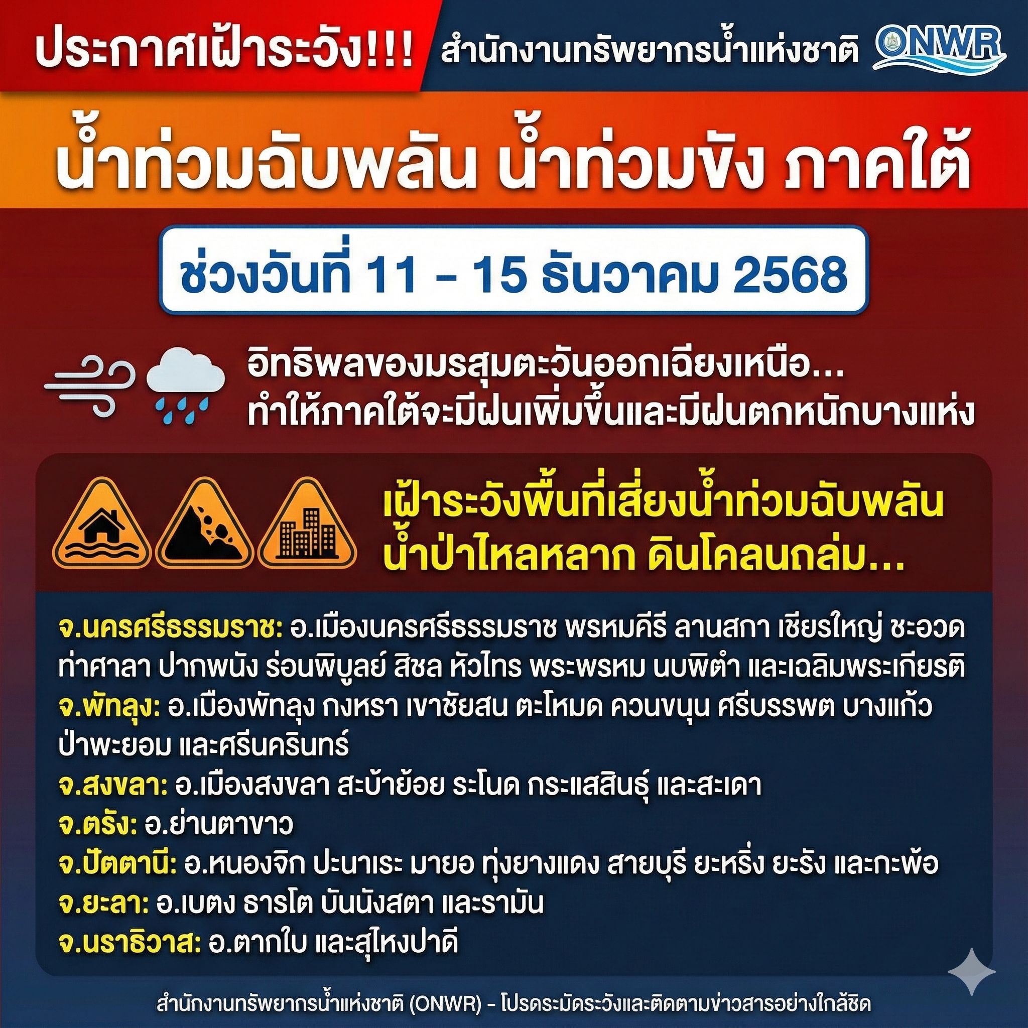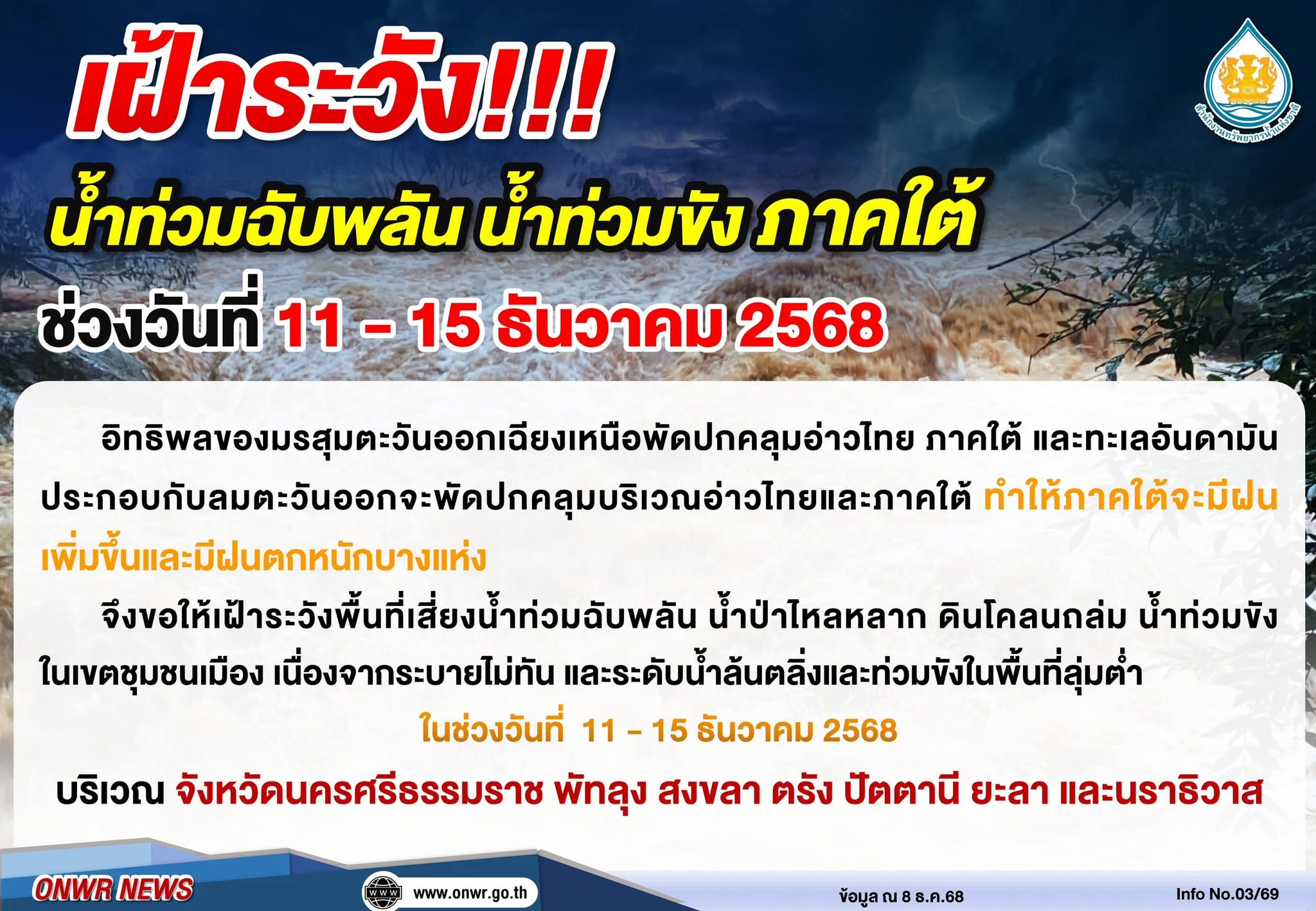 สำนักงานทรัพยากรน้ำแห่งชาติ ประกาศเฝ้าระวัง!!! น้ำท่วมฉับพลัน น้ำท่วมขัง ภาคใต้ ช่วงวันที่ 11 - 15 ธันวาคม 2568
