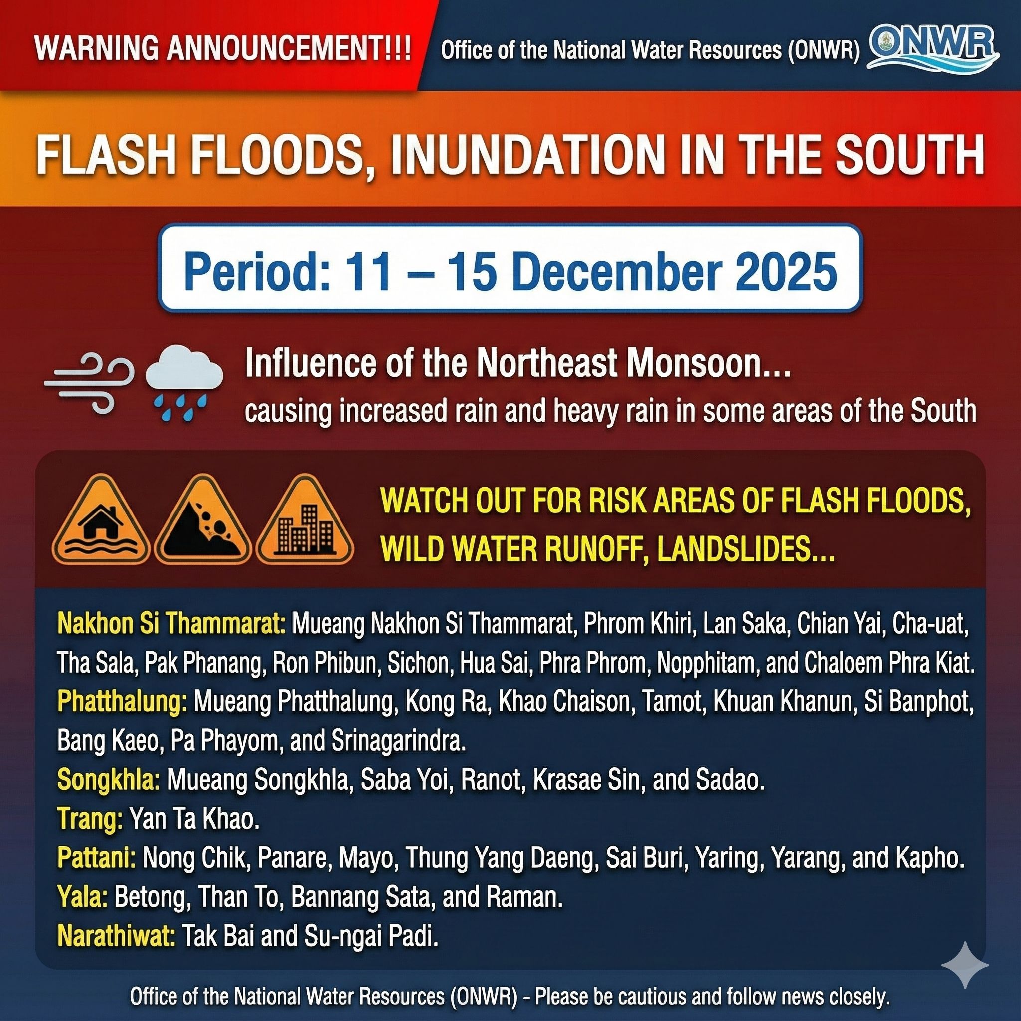 จึงขอให้เฝ้าระวังพื้นที่เสี่ยงน้ำท่วมฉับพลัน น้ำป้าไหลหลาก ดินโคลนถล่ม น้ำท่วมขังในเขตชุมชนเมือง เนื่องจากระบายไม่ทัน และระดับน้ำล้นตลิ่งและท่วมขังในพื้นที่ลุ่มต่ำในช่วงวันที่ 11 - 15 ธันวาคม 2568 บริเวณ จังหวัดนครศรีธรรมราช พัทลุง สงขลา ตรัง ปัตตานี ยะลา และนราธิวาส