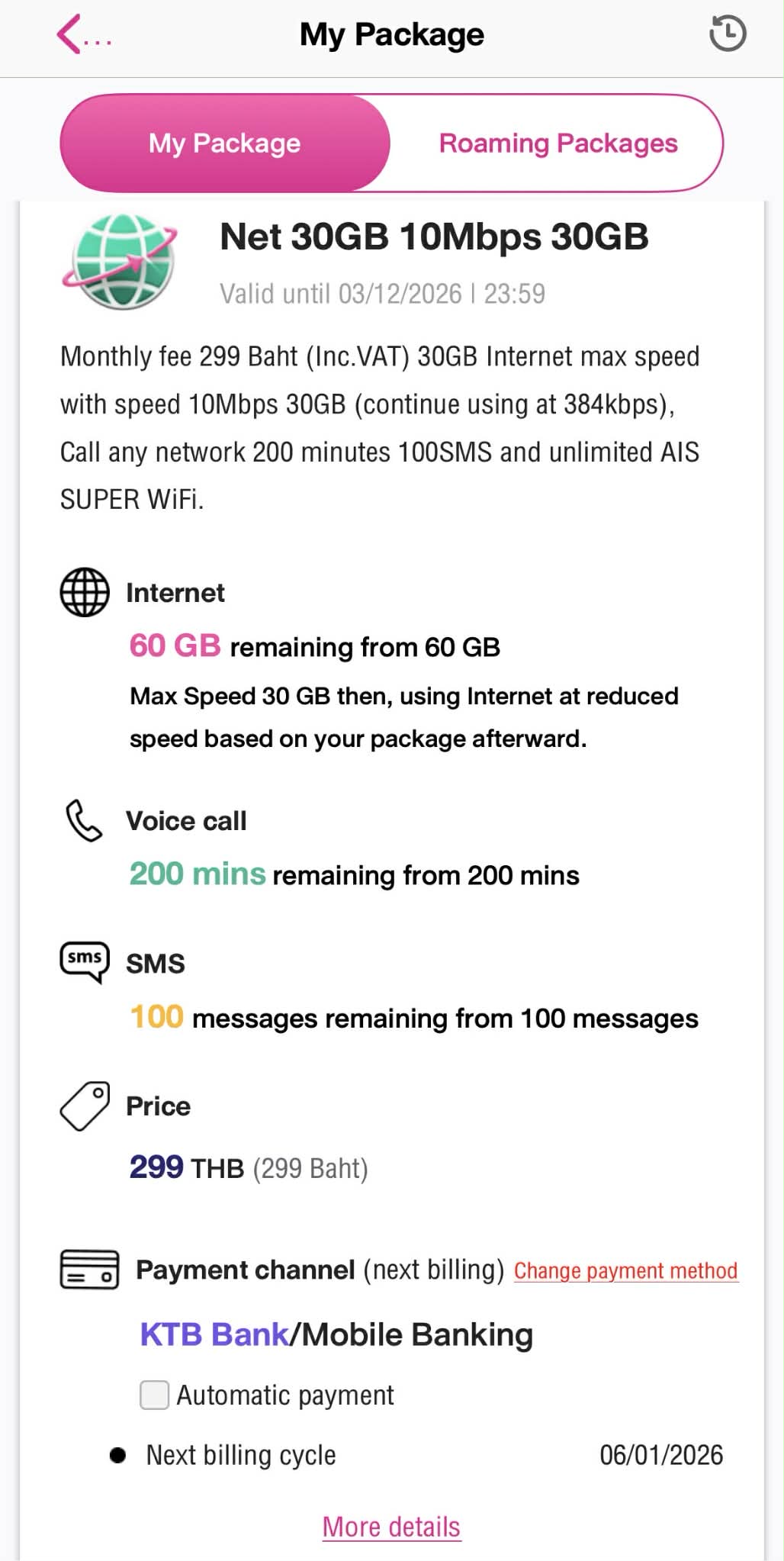 2. ก่อนหน้านี้ใช้แพ็กเกจหลักอีกตัวที่ราคา 99 บาท ได้ เน็ต 10Gb ต่อปี พอหมดแพ็กเกจหายไป ก็พบว่าตัดจ่ายแพ็กเกจเสริมไม่ได้เลยออกมาเป็นแบบข้อ 1 เพราะแพ็กเก็จหลัก มีให้เลือกไม่กี่ตัว และการติดต่อสอบถามก็ยากเย็น คุยในแชทก็เป็น AI ที่คุยไม่รู้เรื่อง โทรไปที่เบอร์ AIS ก็เจอ AI ที่ฟังไม่รู้เรื่องโอนสายไปหาบริการที่ไม่เกี่ยวข้อง สุดจะบรรยาย