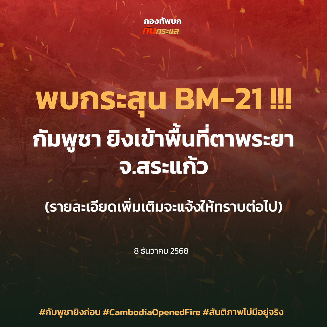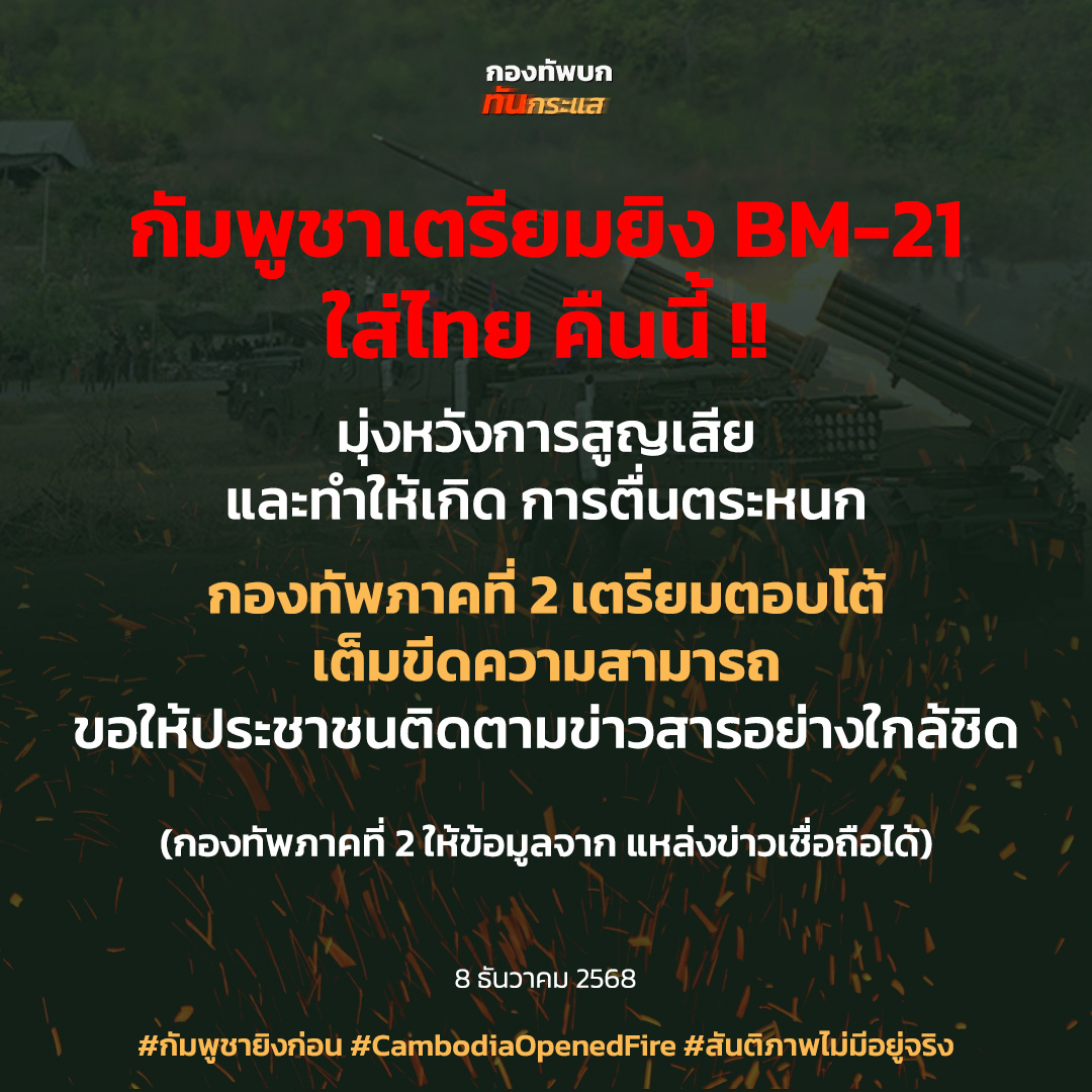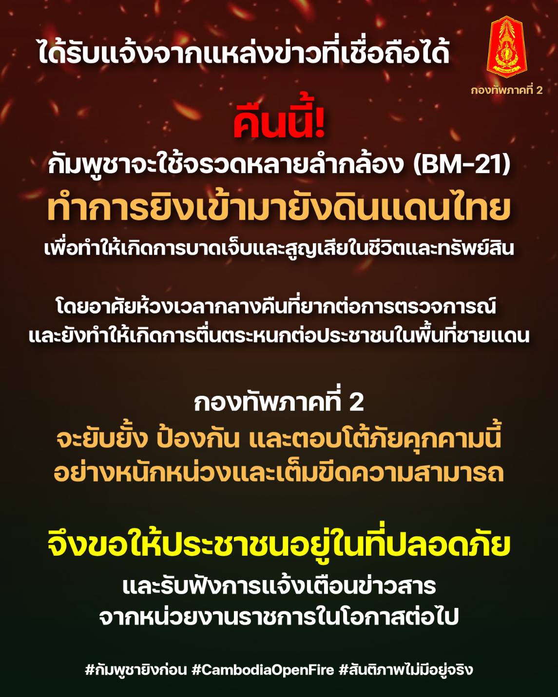 ด่วน!! กองทัพภาคที่ 2 แจ้งเตือน กัมพูชาเตรียมยิง BM-21 ใส่ไทย คืนนี้ !! มุ่งหวังการสูญเสีย และทำให้เกิดการตื่นตระหนก