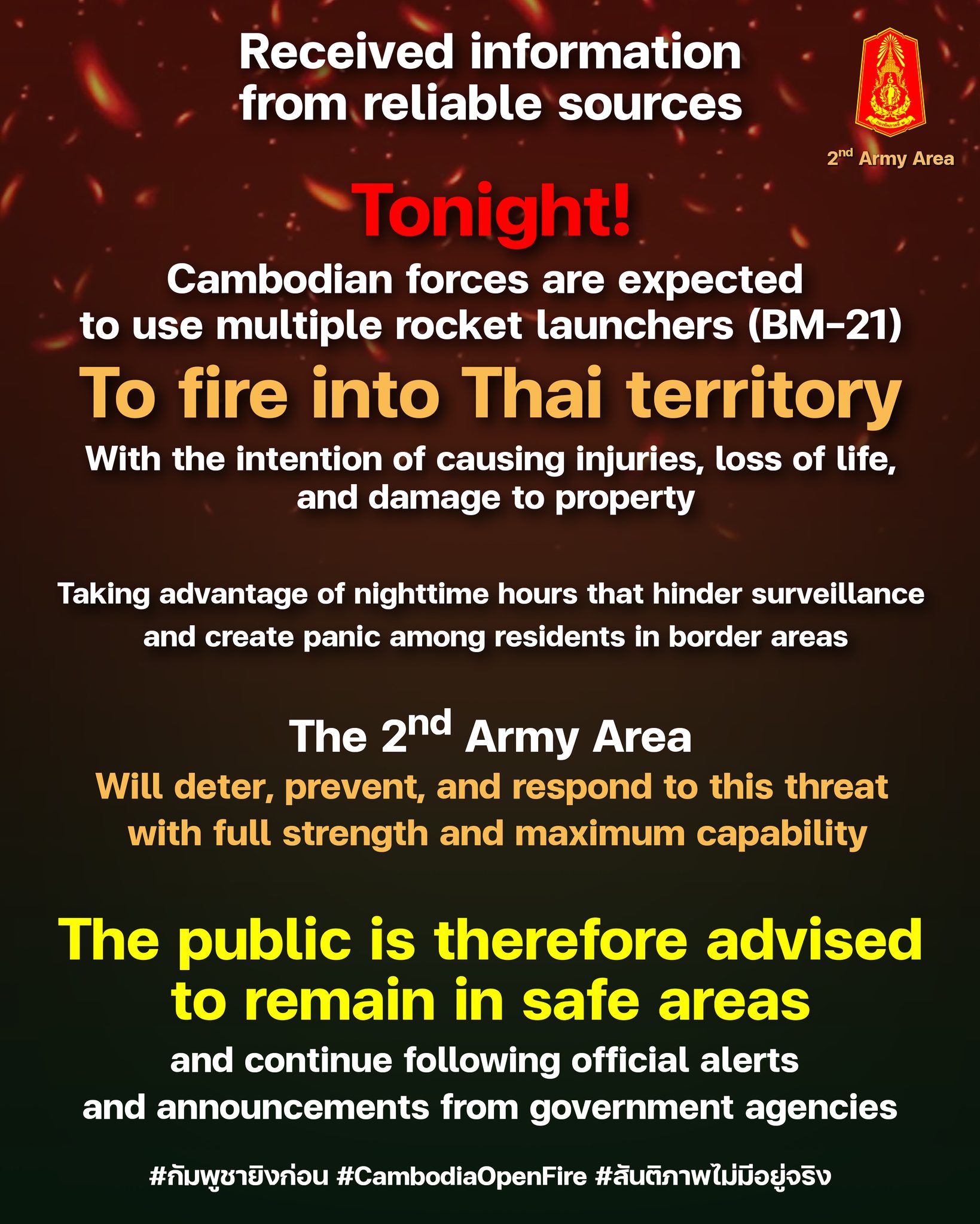 Tonight!, Cambodian forces are expected to use multiple rocket launchers (BM-21) to fire into Thai territory with the intention of causing injuries, loss of life and damage to property