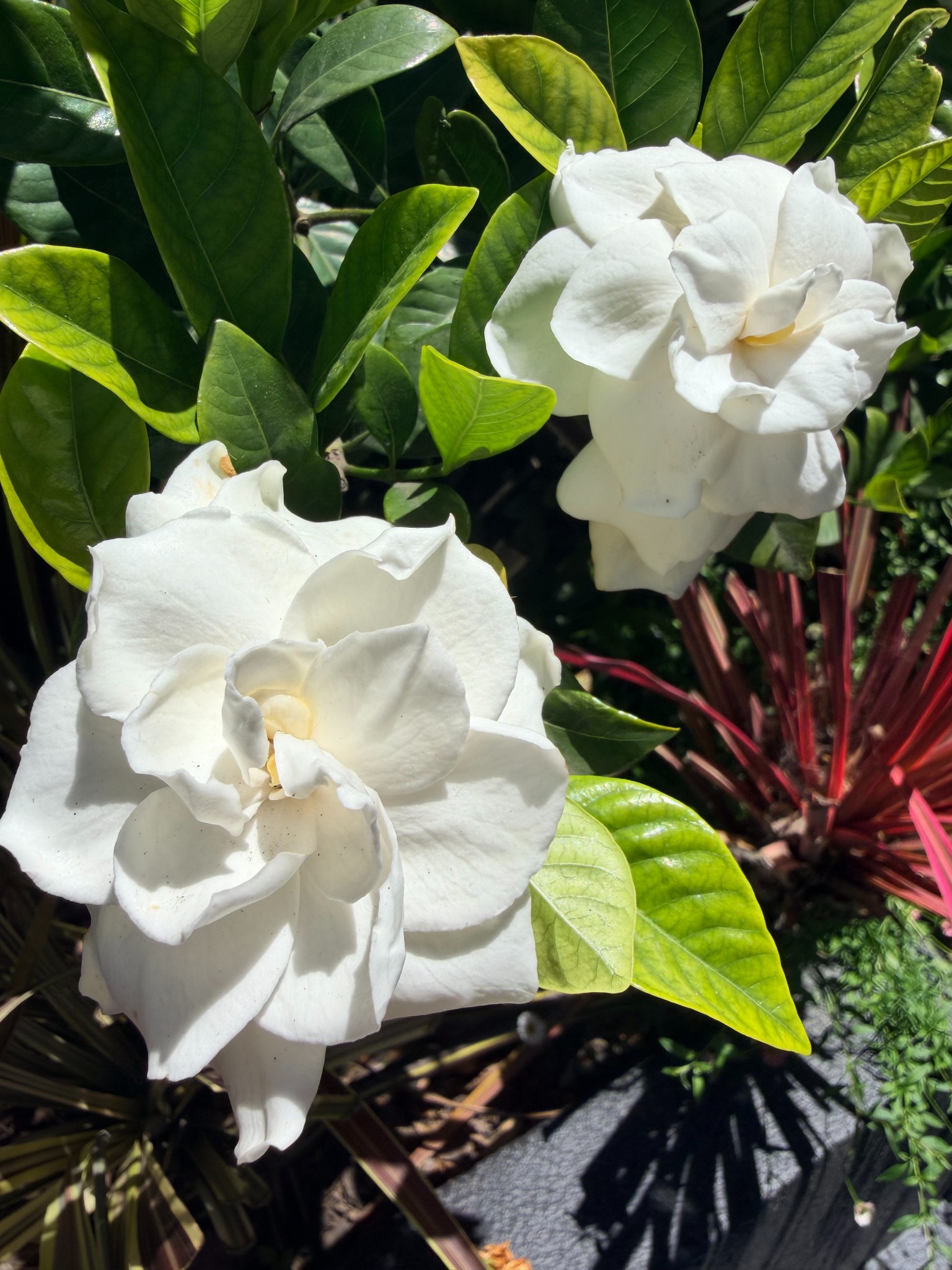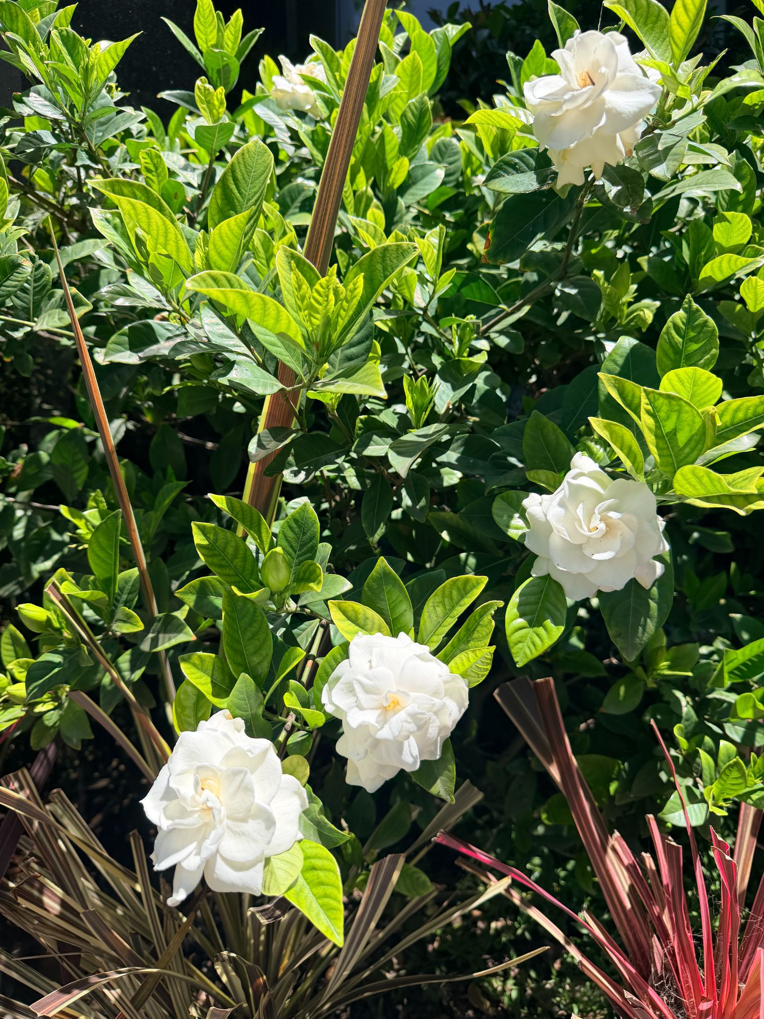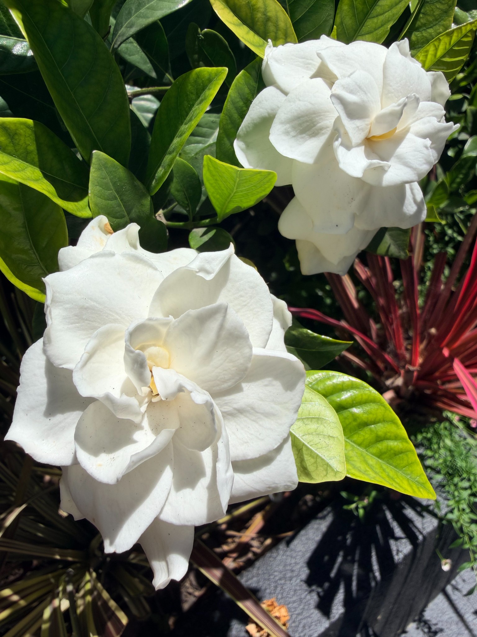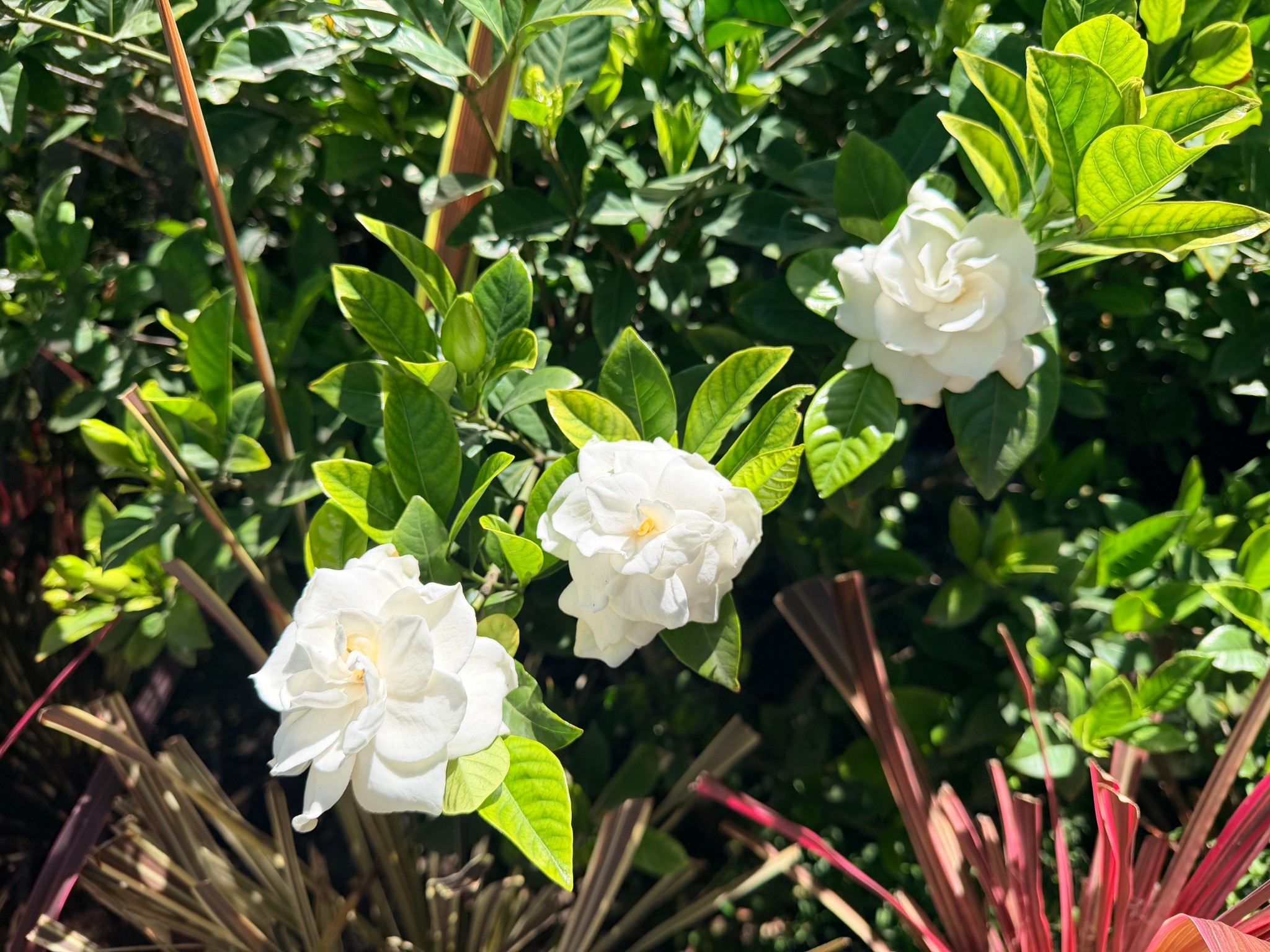 น่าจะซื้อมาเป็นสิบ ๆ ปีแล้ว ถามใครในบ้านก็จำชื่อไม่ได้ครับ 2 ต้นนี้เดิมอยู่ในกระถางเหมือน ๆ กัน แต่ต้นซ้ายน่าจะรากเขาเดินลงดินจนกระถางแตก เลยดูโตกว่าต้นขวา ต้นขวาจะแกร็น ๆ หน่อย ดอกจะขาวมีกลีบซ้อนเห