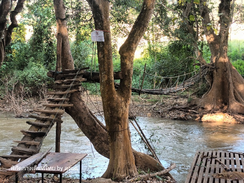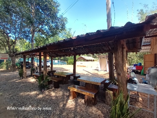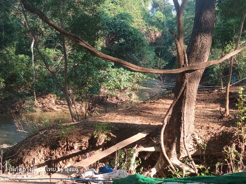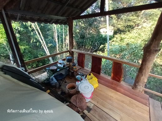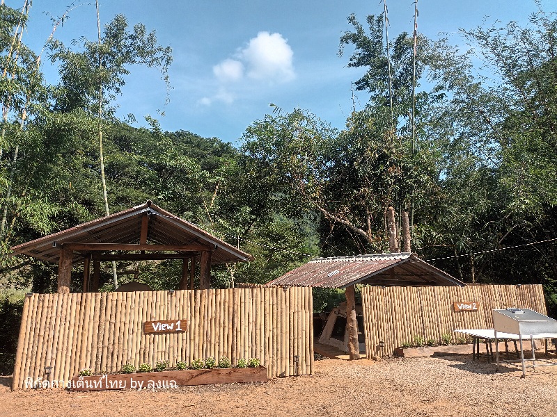 จอดรถ น้องเจ้าของลานออกมาต้อนรับและพาไปดูจุดกาง ผมทักมาเมื่อวานแล้ว ที่กางมี 2 จุดคือตรงลานจอดรถ ตรงนี้เป็นแคร่ไม้หนาๆ ยกพื้นมีหลังคาและรั้วไม้ไผ่กั้น 2 หลัง ทำดีมากๆ เลย น่าจะกว้าง 2.5 ม. ยาว 4 ม.ได้ และอีกจุดคือริมน้ำ มีแคร่ไม้สำหรับเต็นท์เล็กๆ ให้กางได้ กับลานดินที่พอจะลงเต็นท์หลังใหญ่ได้ แต่สะพานไม้ยังทำได้แค่ไม้แผ่นเดียวพาด แต่อีกไม่นานน่าจะเสร็จครับ