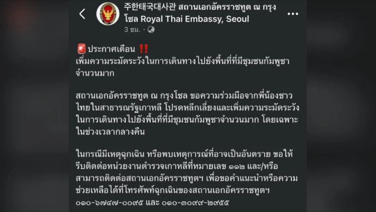 อย่างไรก็ตาม วันนี้ (8 ธ.ค.) สถานเอกอัครราชทูต ณ กรุงโซล ออกประกาศ เตือนคนไทยในเกาหลี เพิ่มความระมัดระวังในการเดินทางไปยังพื้นที่ที่มีชุมชนกัมพูชาจำนวนมาก