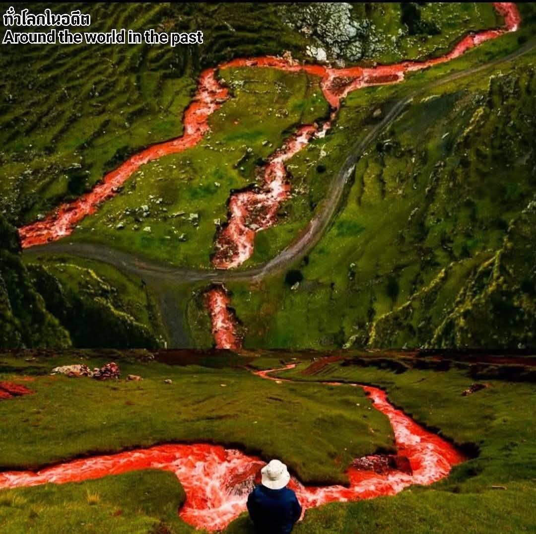 แม่น้ำแดงในเขต Vinicunca ของแคว้น Cusco ในประเทศเปรู…🇵🇪 เป็นสิ่งมหัศจรรย์ทางธรรมชาติที่น่าทึ่ง ซึ่งรู้จักกันดีจากสีแดงสดใส ซึ่งเกิดจากความเข้มข้นสูงของออกไซด์ เหล็ก และหินตะกอน ที่อุดมด้วยแร่ธาตุอื่น ๆ