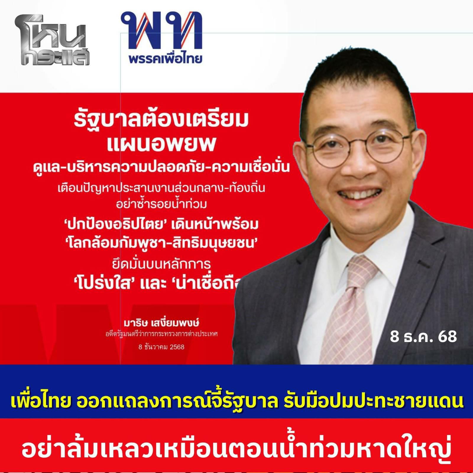 พรรคเพื่อไทยโดยนายมาริษ เสงี่ยมพงษ์ จี้รัฐบาลรับมือศึกชายแดนกัมพูชา อย่าล้มเหลวแบบตอนน้ำท่วมหาดใหญ่