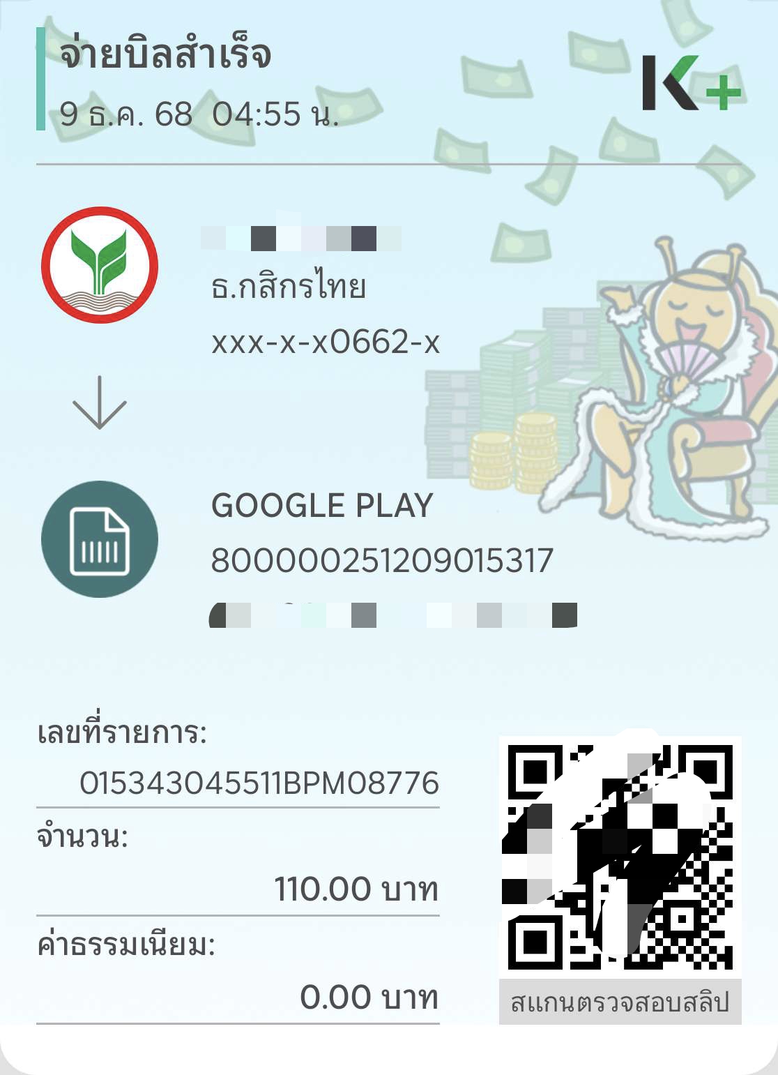 เติมเหรียญแอป MR. BLUE ผ่าน Google Play (K PLUS) เงินตัดแล้วแต่เหรียญไม่เข้าครับ