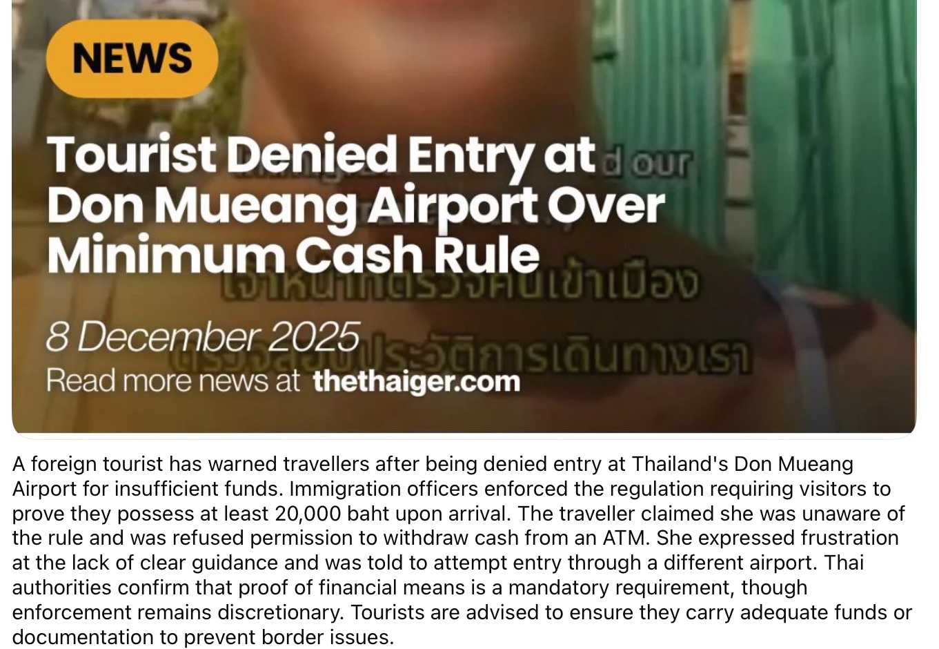 เหตุเกิดที่ดอนเมือง นักท่องเที่ยวมีประวัติน่าสงสัย เลยโดนปฏิเสธการเข้าเมืองเนื่องจากไม่มีเงินสด(หรือแคชเชียเช็ค) ติดตัวขั้นต่ำ 20000 บาท