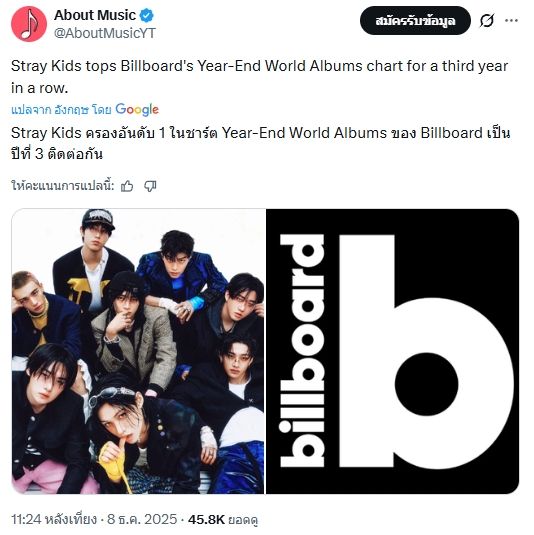 🔥 Stray Kids เป็นศิลปิน K-Pop ที่ครองอันดับ 1 บนชาร์ต Billboard Year-End World Albums 2025 เป็นปีที่สามติดต่อกัน!!!